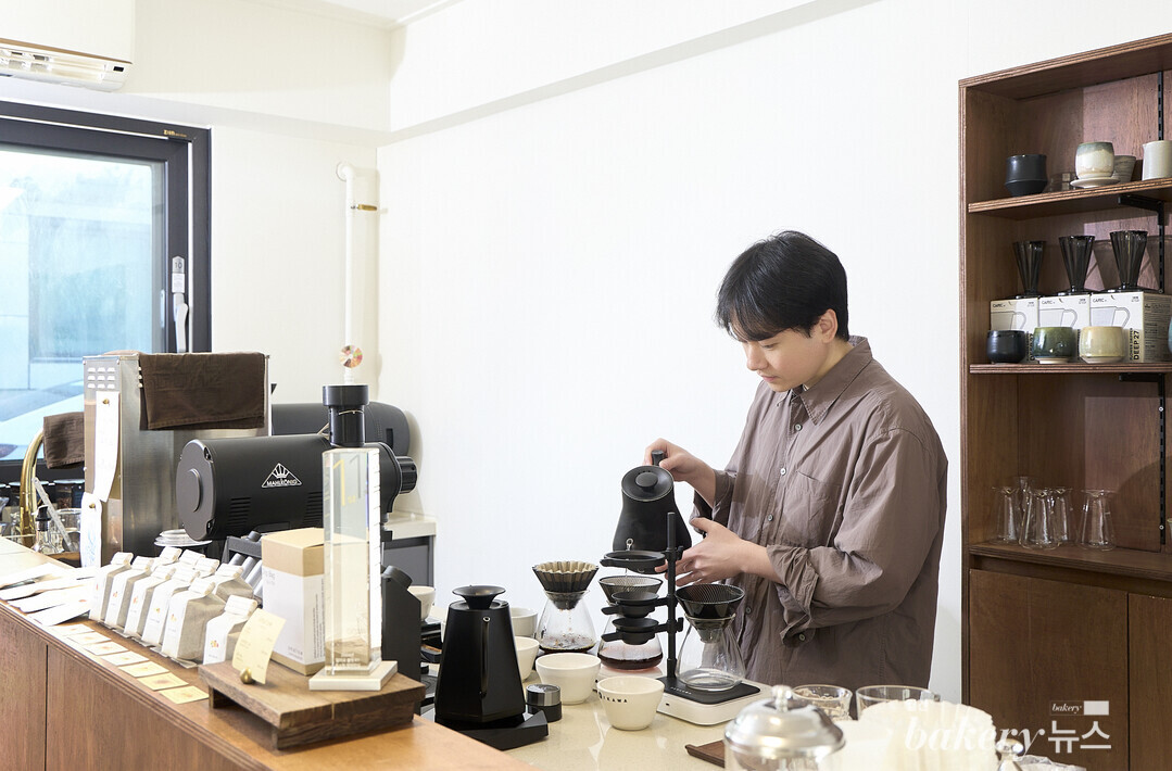 투명한 유리문을 열고 매장에 들어서면 작은 나무 테이블 3개와 카운터가 시선에 들어온다. 자그마한 공간이 주는 안정감과 괜스레 느껴지는 편안함은 덤이다. “손님이 커피를 마시며 서로 대화를 나누는 것도 물론 좋지만, 온전히 커피에만 집중하는 공간을 만들고 싶었습니다.” 그 때문에 카운터의 높이가 약간 높은 편인데, 손님이 자리에서 카운터 쪽을 바라보며 멍하니 커피를 즐길 수 있도록 한 김형주 대표의 배려다. 바쁜 현대 사회 속에서 일분일초를 쪼개며 사는 이들에게 잠시라도 숨 쉴 수 있는 위로의 공간을 만들고 싶었다는 그의 바람이 매장에서 그대로 드러난다.