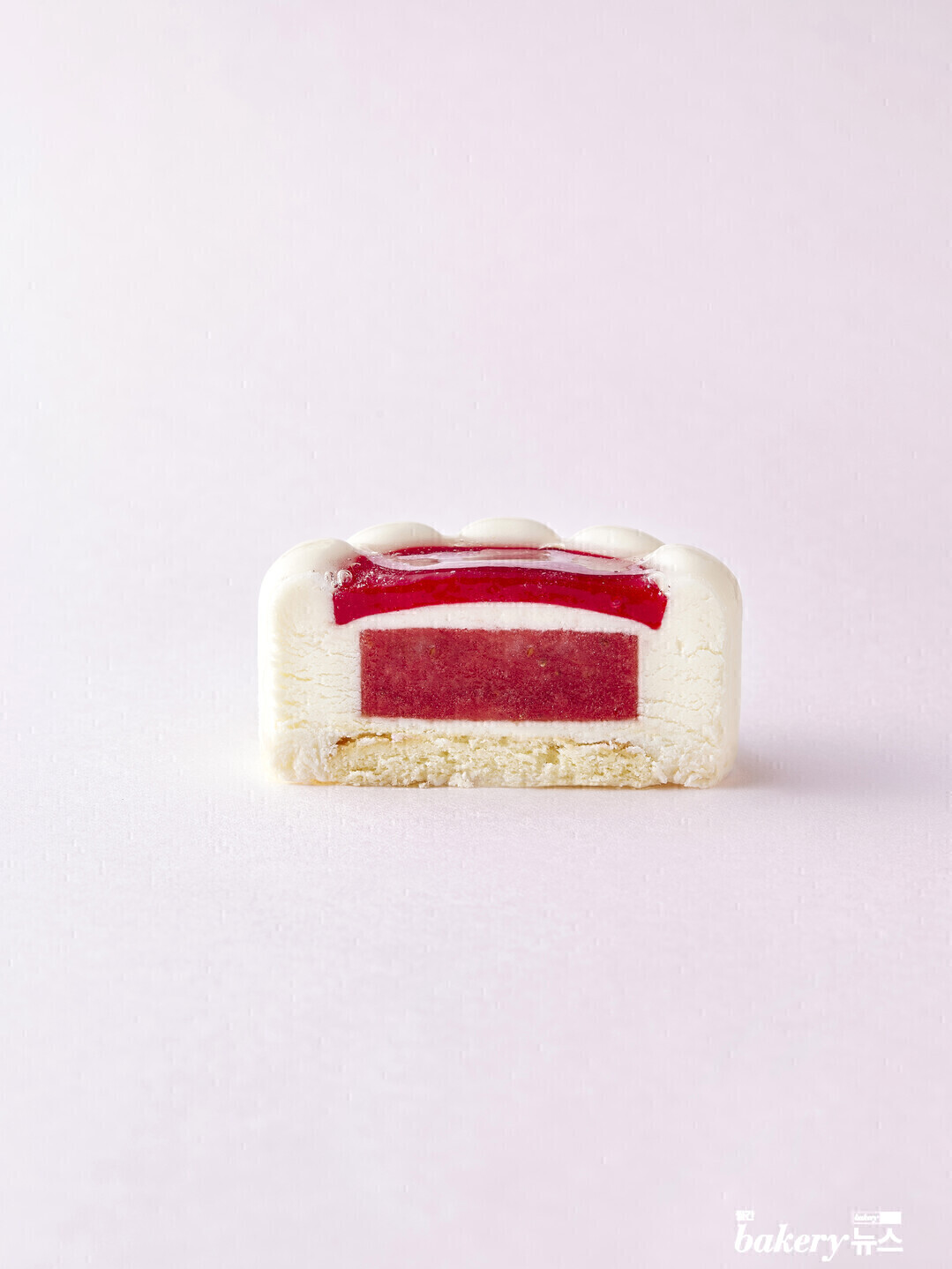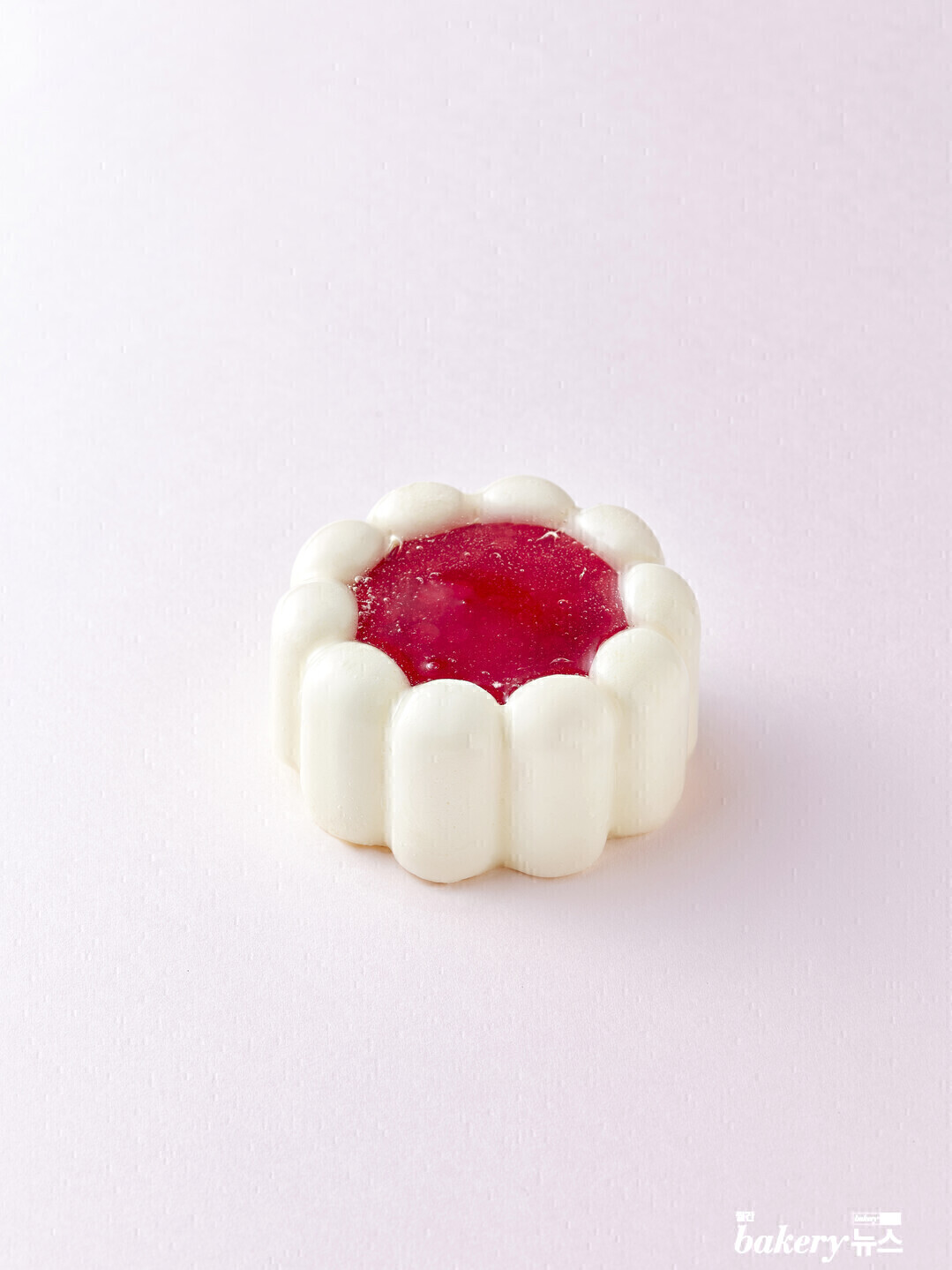 2 ①을 몰드에서 제거한 후 윗부분에 ‘베리 크림’을 짜 넣은 다음 냉동실에서 굳힌 뒤 30℃로 맞춘 ‘글라사주’를 글레이징하여 마무리한다