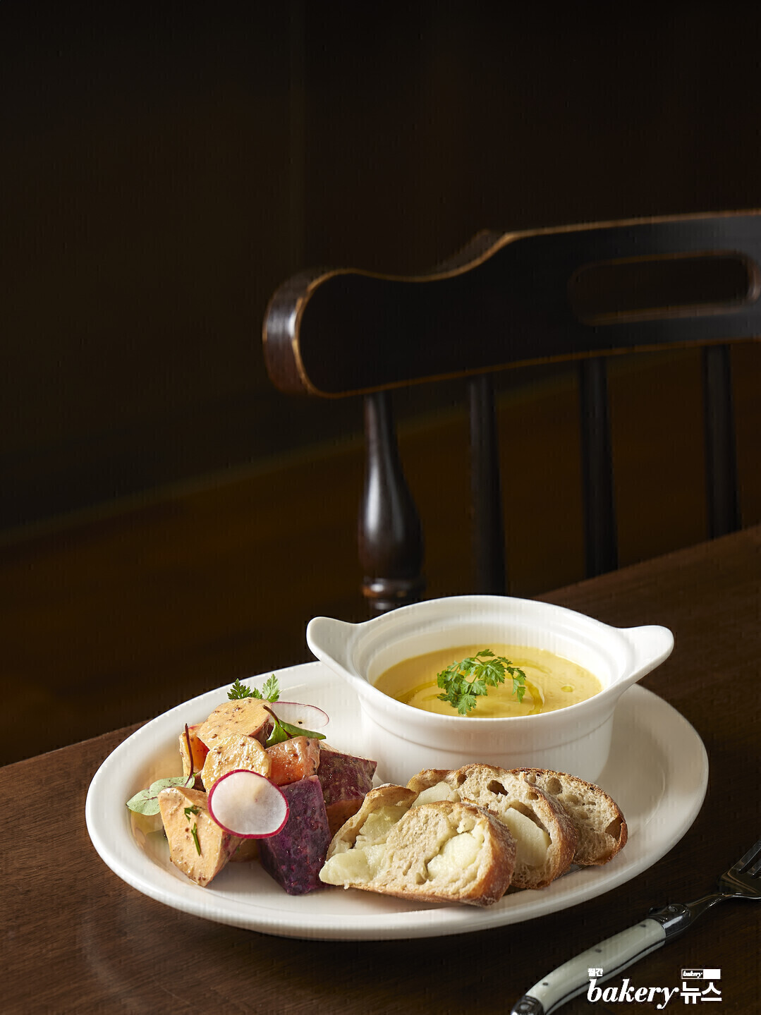 준비한 접시에 ‘고구마 머스터드 샐러드’를 얹은 후 볼에 담은 고구마 채소 수프를 배치한 다음 고구마 캄파뉴를 곁들여 마무리한다