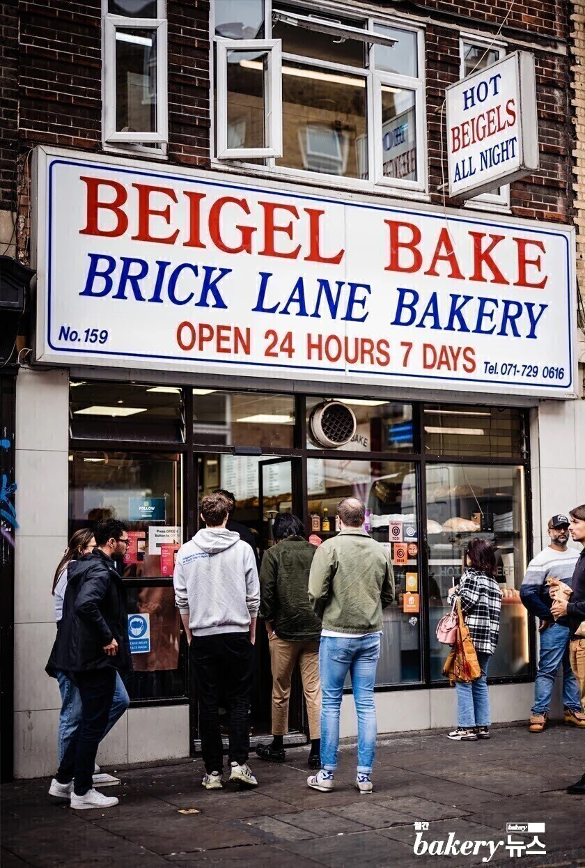 ‘베이글 베이크(Beigel Bake)’는 1974년 암논 코헨(Amnon Cohen)과 새미 민즐리(Sammy Minzley) 형제가 문을 연 뒤, 지금까지 같은 자리에서 운영되고 있는 베이글 전문 베이커리다. 이른 오후에 문을 닫고 휴무일을 갖는 것이 일반적인 대부분의 베이커리와는 다르게 하루 24시간 연중무휴로 운영되는, 영국에서는 찾아보기 힘든 형태의 베이커리이기도 하다. 베이글 베이크가 위치한 브릭레인은 유대인과 방글라데시·카리브해·동유럽 이민자 공동체가 함께 만든 다층적인 식문화가 스며 있는 지역으로 베이글 베이크 역시 동유럽 유대식 전통에 뿌리를 두고 있다. 이곳은 베이글 반죽을 먼저 삶아 오븐에 굽는데, 겉은 단단하고 속은 쫀득한 질감을 갖는 것이 특징이다. 베이글 베이크는 온라인에 기본 베이글의 레시피를 공개하고 있기 때문에 집에서 재현해보고 싶은 사람이라면 도전해볼 만 하다.