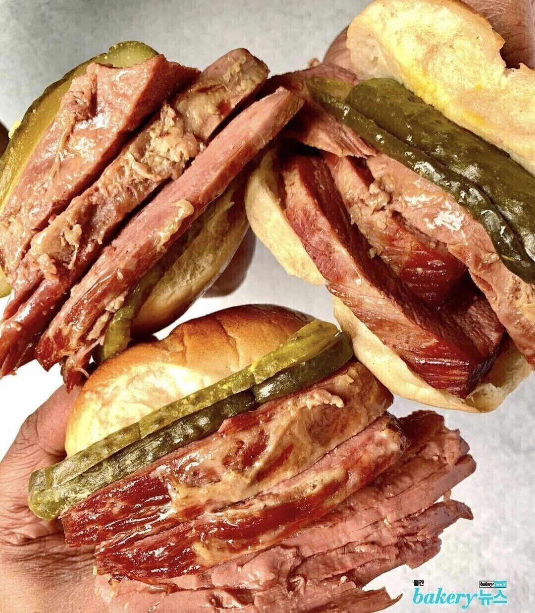 베이글 베이크의 간판은 하얀 바탕에 파란색과 빨간색 글씨로 멀리서도 단번에 눈에 띈다. 안으로 들어서면 조리 공간이 그대로 보이는 오픈 델리 구조인데, 줄을 서서 기다리다 보면 막 구워진 베이글이 12개씩 트레이에 담겨 나오는 모습을 직접 확인할 수 있다. 주문과 제조가 분리되지 않고 하나의 동선 안에서 이루어지기 때문에 ‘만드는 과정을 함께 본다’는 경험이 자연스럽게 포함되어 기다림이 지루하지 않다. 샌드위치류 역시 구조가 단순한 클래식 메뉴 위주라 회전이 빠르다. 줄이 길어 보여도 생각보다 금방 차례가 돌아온다. 베이글 베이크에서 가장 많이 주문되는 메뉴는 단연 ‘핫 솔티드 비프 베이글(Hot Salt Beef Bagel)’이다. 천천히 삶아 결대로 부드럽게 풀리는 염장 소고기를 두툼하게 끼우고, 알싸한 머스터드와 새콤한 피클을 더한 가장 기본적인 조합이다. ‘훈제 연어와 크림치즈 베이글’도 꾸준히 사랑받는 메뉴다. 기름기 없이 얇게 저민 훈제 연어와 부드러운 크림치즈가 베이글의 쫀득한 식감과 자연스럽게 어우러진다. 두 메뉴 모두 화려한 조합은 아니지만, 시간이 지나도 생각나는 맛이라는 점에서 매력이 있다. 크기가 꽤 넉넉해 식사 대용으로도 손색이 없다.