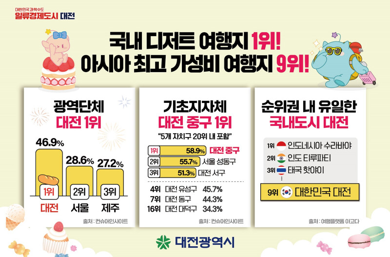 여행 리서치 전문 기관인 컨슈머인사이트가 실시한 ‘2025 여행자·현지인의 국내 여 행지 평가 및 추천조사’ 디저트류 추천 광역시 부문에서 대전시가 46.9%의 추천율을 기록하며 1위에 올랐다. 이는 2위인 서울특별시(28.6%)보다 18.3%p 높은 수치다. 기초자치단체 가운데서는 성심당 본점이 위치한 대전 중구가 58.9%의 추천율로 1위를 차지했다. 이는 2019년 36% 대비 20%p 이상 상승한 수치로, 전국 순위도 4계단 뛰어올랐다. 중구 외에도 서구(3위), 유성구(4위), 동구(7위), 대덕구(16위) 등 대전의 모든 자치구가 20위권에 포함돼, 대전시 전역이 ‘디저트 명소’로 자리매 김한 것으로 나타났다.