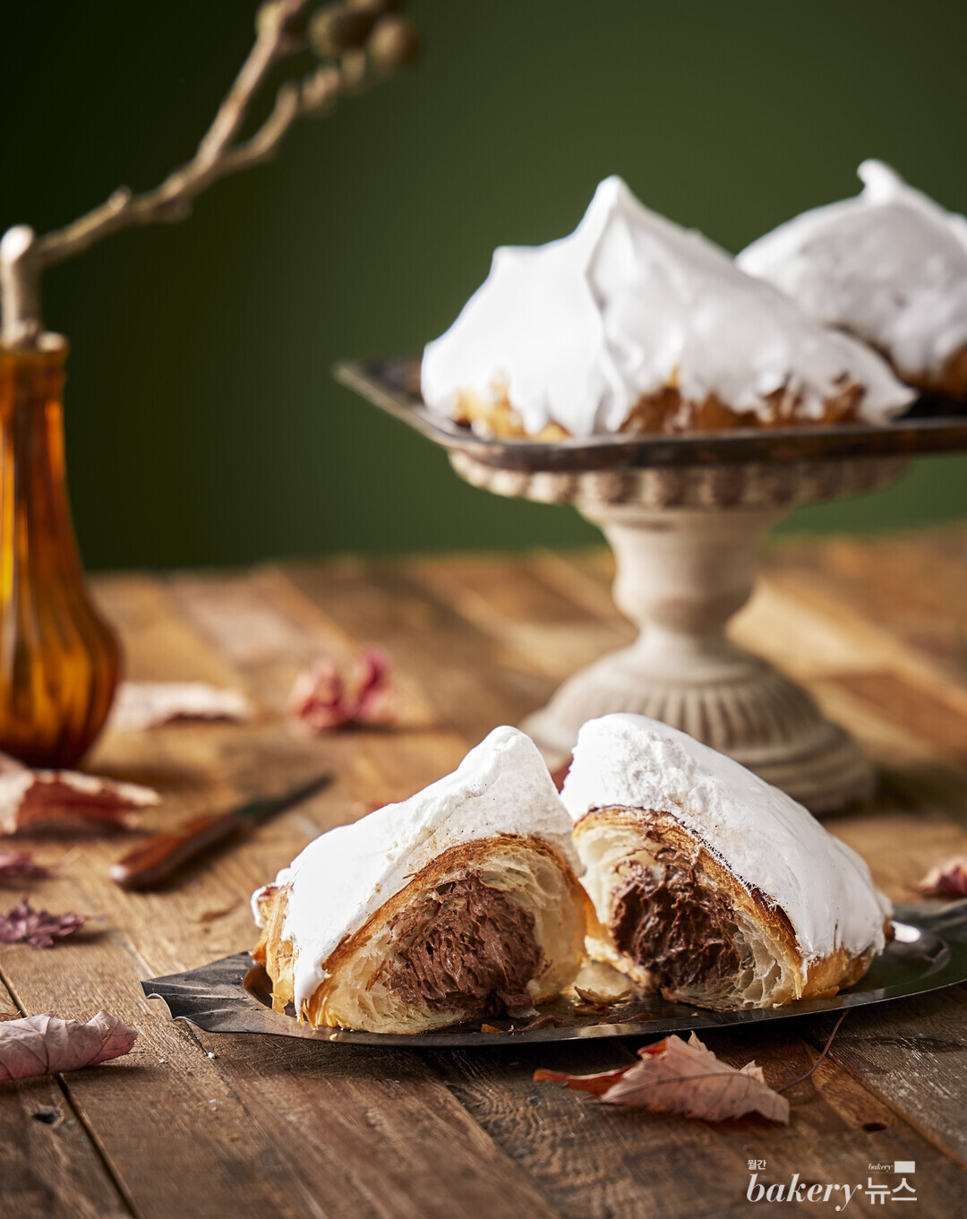 1 ‘크루아상’ 바닥에 구멍을 3개 뚫은 후 휘핑한 짤주머니에 담은 ‘저당 가나슈 몽떼’를 채워 넣는다