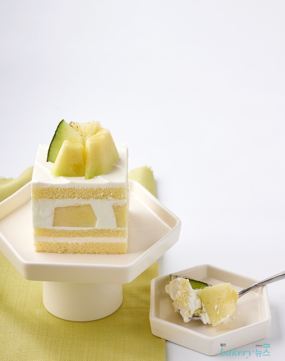 5 ④ 위에 사각으로 자른 멜론을 올린 후 ‘멜론 크림’ 220g을 샌드한다