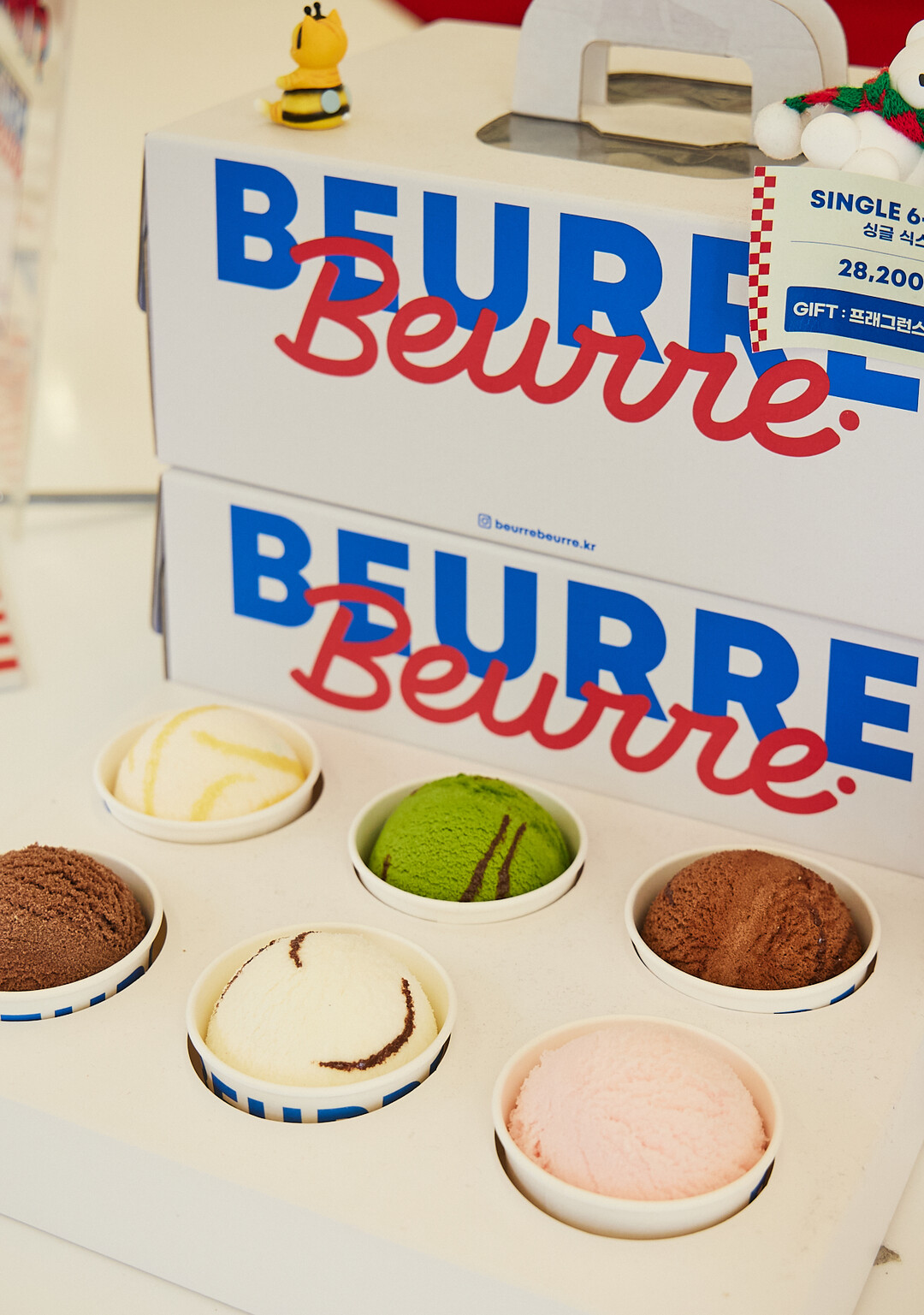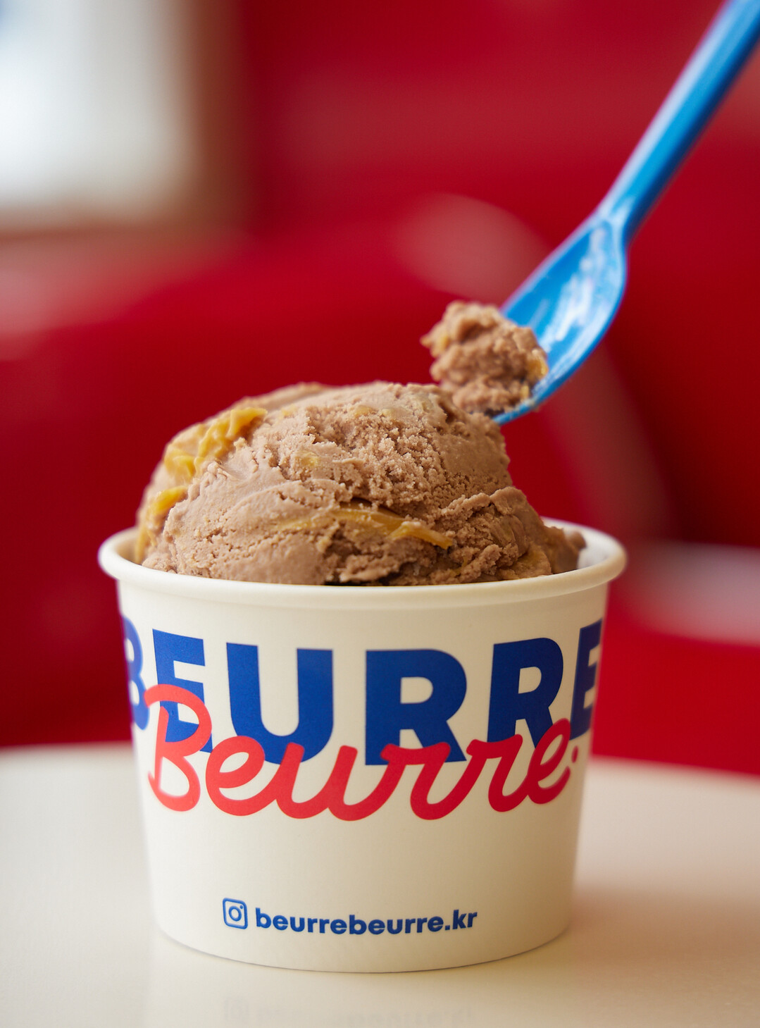 사실 한국에는 이미 오래전부터 입지가 굳건한 아이스크림 브랜 드가 있기에 아이스크림이라는 아이템으로 시장에 뛰어들기란 쉬운일이 아니었다고. 하지만 박용인 대표는 아이스크림을 늘 정해진 틀 안에서 선택할 수밖에 없다는 점에 주목했다. 맛뿐만 아니라 이야기, 경험, 감정까지 녹여낸 새로운 아이스크림을 만들고 싶다는 일념 아래 뵈르뵈르는 시작됐다. “아이스크림이 사실 어릴 적 부터 누구나 쉽게 접하던 익숙한 디저트잖아요. 누군가에겐 조금 낯설 수도 있는 젤라또보다 쉽게 접근할 수 있는 아이스크림이야말 로 대중적인 울림을 줄 것으로 생각했습니다.” 이러한 뵈르뵈르 아이스크림의 차별점이자 강점은 바로 사용하는 재료다. 프랑스 ‘프레지덩 버터’를 사용하는데, 덕분에 아이스크림은 진한 고소함과 함께 부드럽고 쫀득한 식감을 자랑한다. 메뉴별로 차이가 있지만 버터가 많게는 19%까지 들어가며 이는 입안에 머무는 밀도감, 부드러운 질감 그리고 마무리되는 고소한 여운까지 좌우한다. 입안에서 부드럽고 천천히 녹아내리며 깊은 풍미가 느껴지는 아이스크림은 뵈르뵈르에서만 경험할 수 있는 특별함이다.