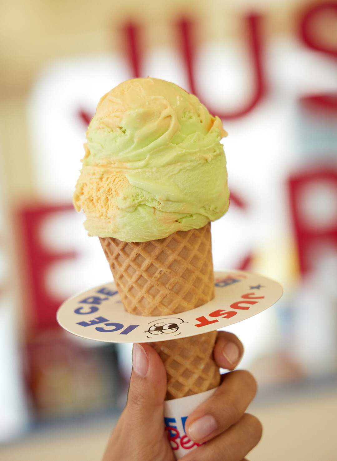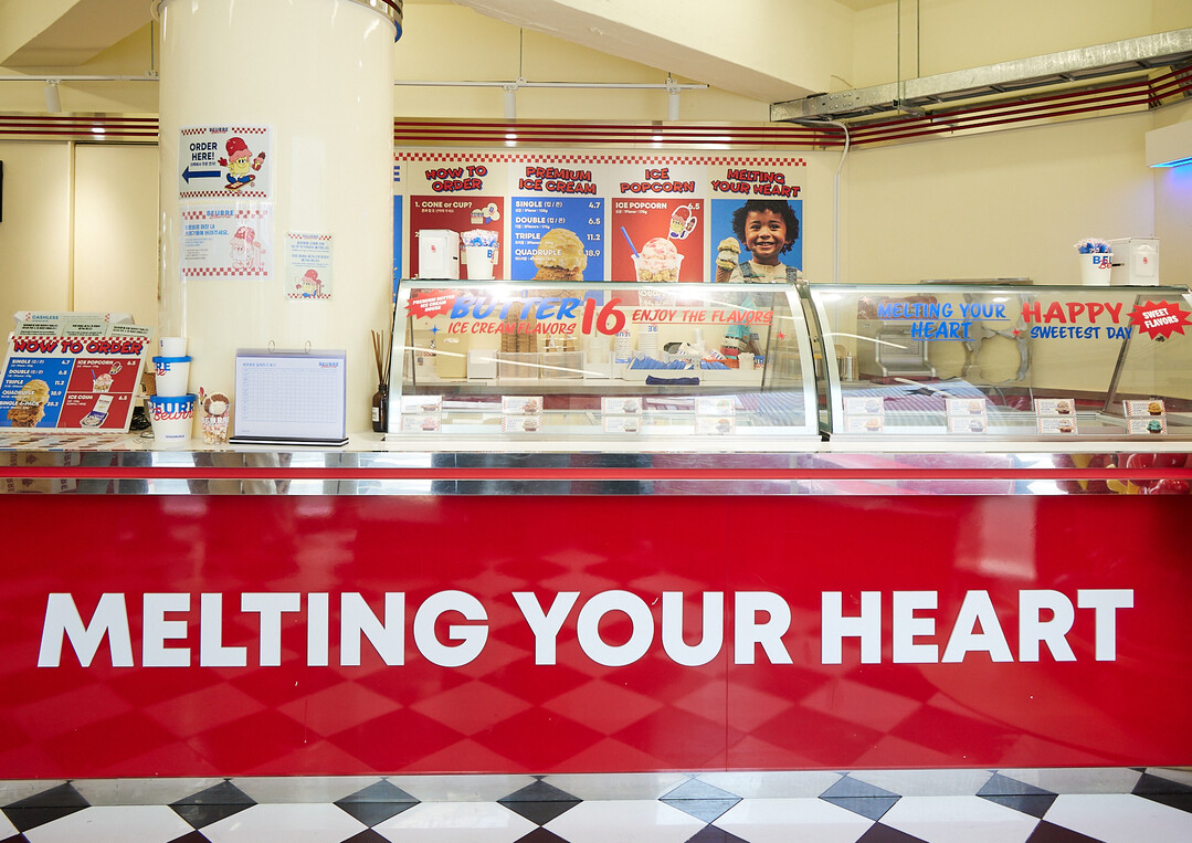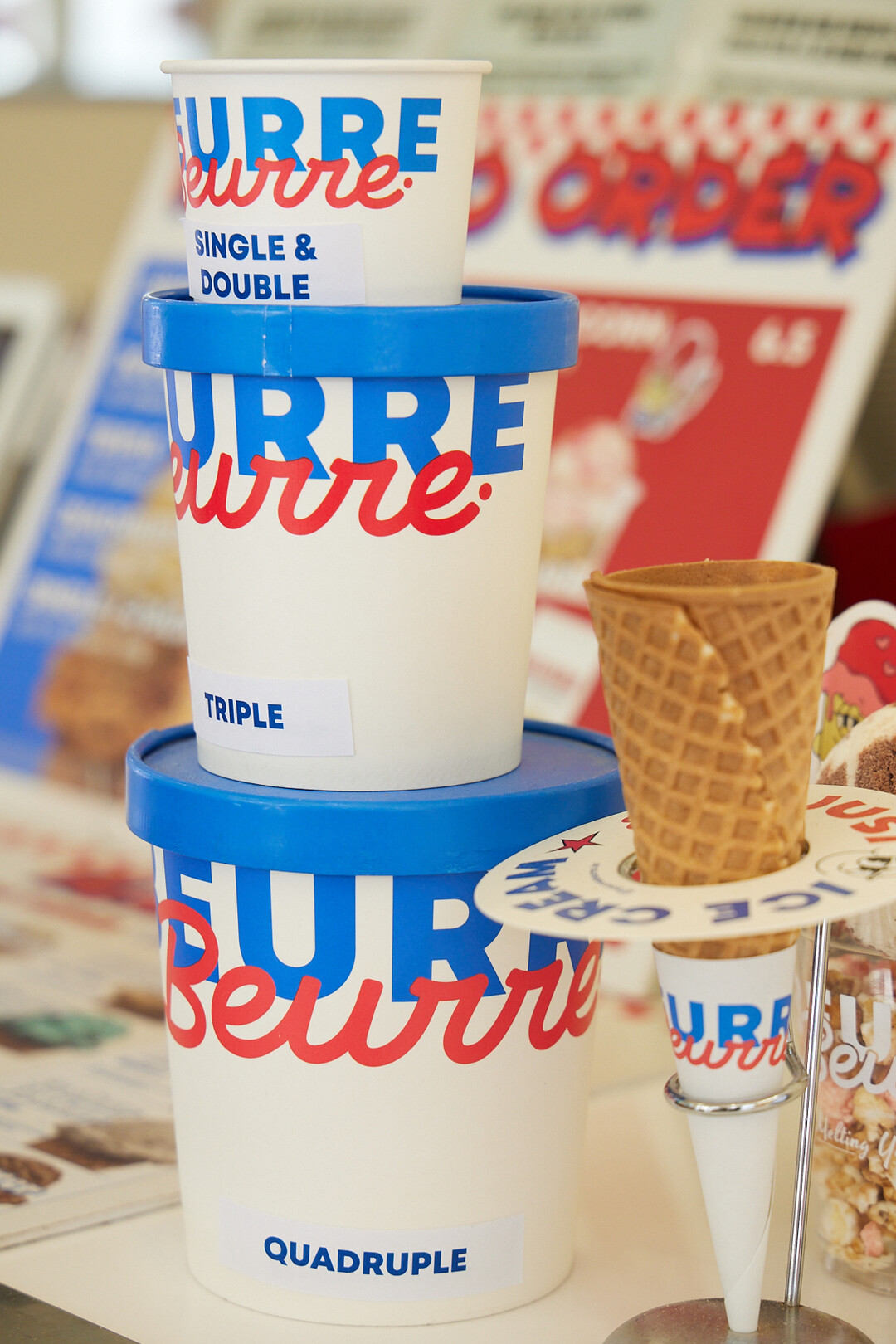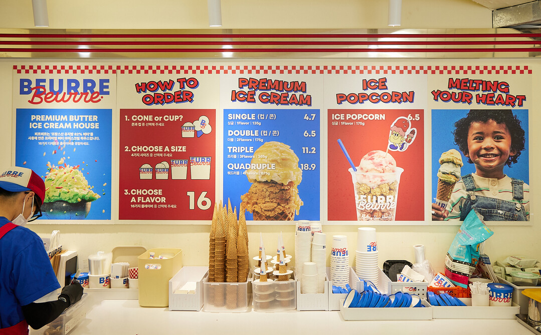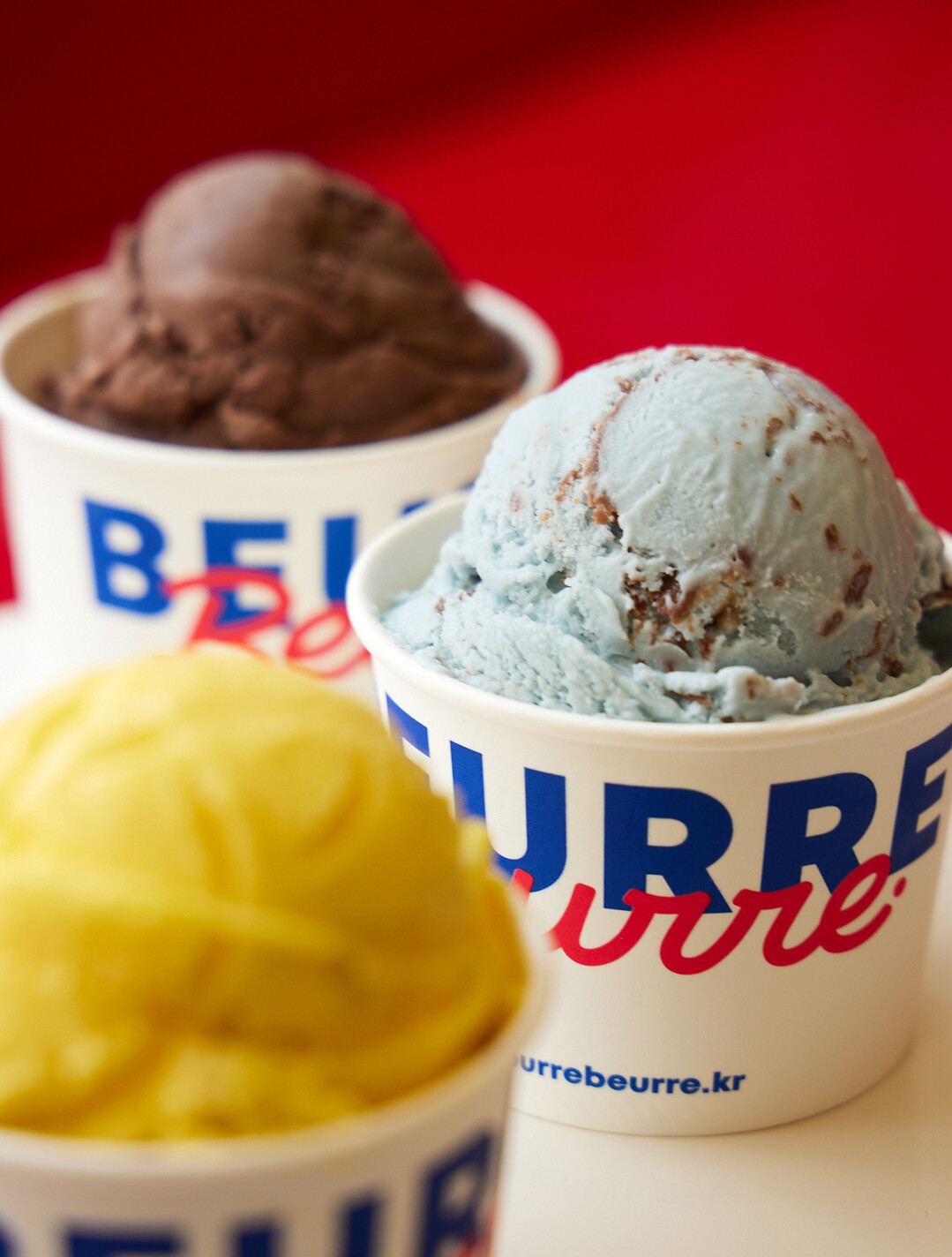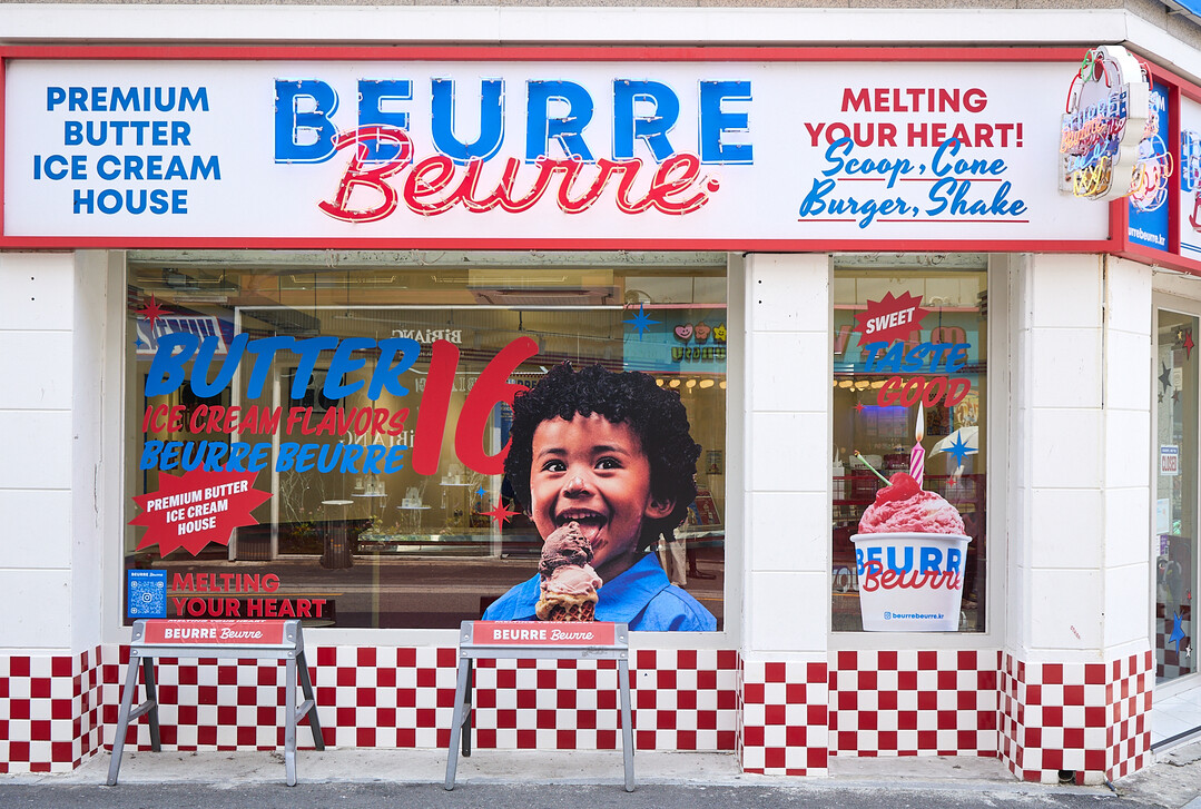 무더웠던 2023년 8월 여름, 서울 성수동에서 첫 발을 내딛은 ‘뵈 르뵈르(Beurre Beurre)’. 프랑스어로 버터를 뜻하는 ‘뵈르(Beur re)’에서 영감을 받은 상호에서 유추할 수 있듯, 뵈르뵈르는 버터 를 메인으로 하는 아이스크림 브랜드다. ‘㈜버추어컴퍼니’ 박용인 대표의 아이디어에서 시작된 이곳에선 1970~1990년대 미국 ‘모타운(Motown)’ 음악이 울려 퍼지며, 미국에서 금방이라도 튀어 나온 듯한 빨강, 파란색 포인트 인테리어는 뇌리에 강렬하게 꽂힌다. 또 귀여운 아이스크림 네온사인과 함께 한쪽 유리창을 가득 채운 외국인 아이의 얼굴은 오히려 이곳이 한국이라는 것이 어색할 정도. 매장 한 편에는 버터맛 김을 비롯해 모자, 컵 등 굿즈들이 자리하고 있다. 뵈르뵈르는 이처럼 단순히 아이스크림을 판매하는 곳이 아닌, 버터를 테마로 한 새로운 미식 경험과 감각적인 공간을 제안한다.