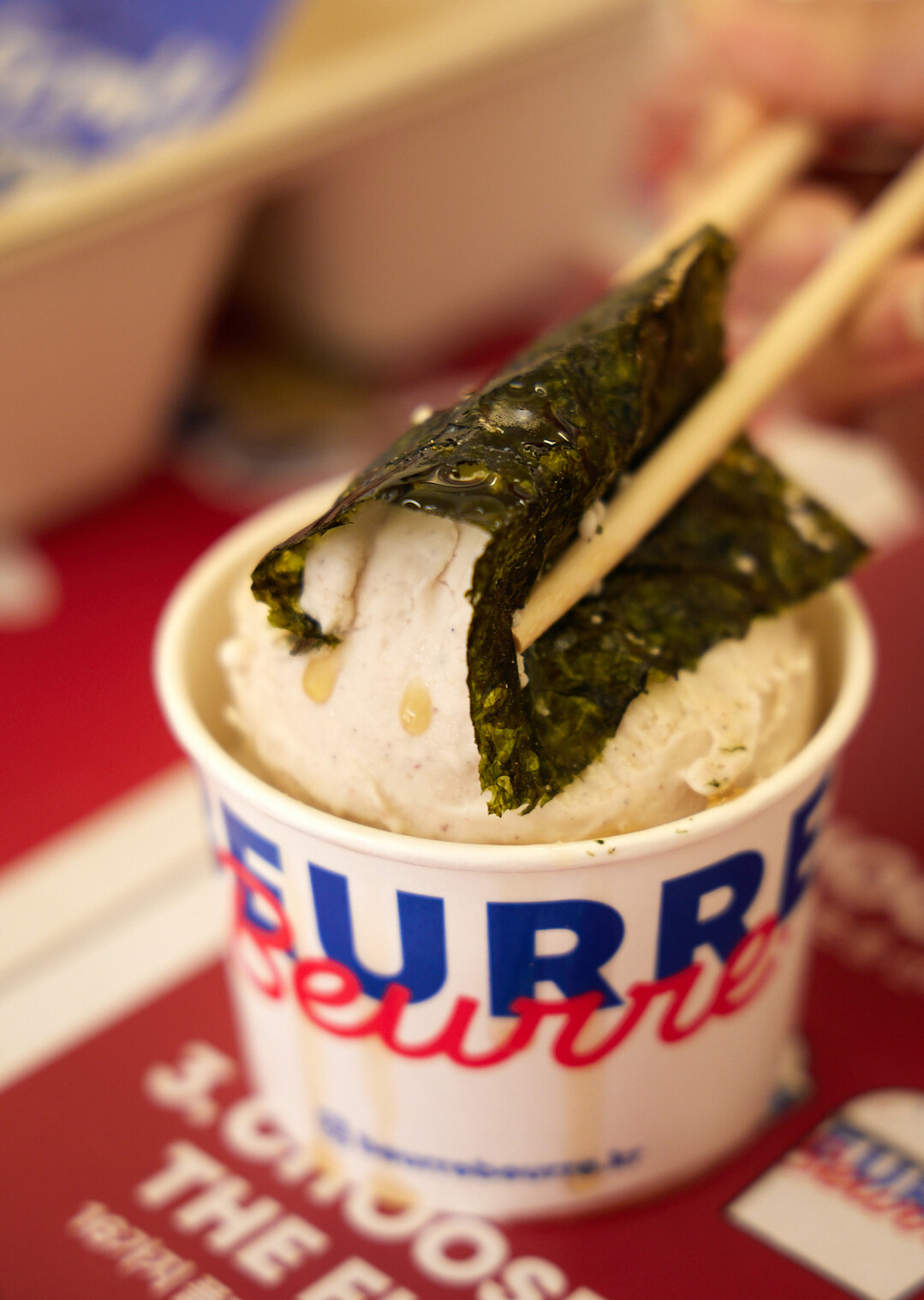 뵈르뵈르는 기본 16가지 라인업을 가지고 있다. 소비자의 트렌드를 읽고 이를 토대로 맛의 균형, 질감, 향의 조화를 기본으로 개발하는데 때로는 의외의 재료를 조합하거나 기존의 상식을 뒤집기도 한다. “흰쌀밥에 김을 싸 먹는 것에서 착안해 쌀이 들어간 아이스크림을 버터맛 김에 싸먹는 메뉴를 만들었습니다. 참기름을 직접 뿌려 먹을 수 있도록 함께 제공하는데, 예상보다 궁합이 아주 좋습니다.” 이렇듯 뵈르뵈르만의 감성과 창의성을 언제나 담아낼 수 있도록 전문가의 끊임없는 피드백을 거쳐 메뉴를 개발하고 있는데, 이것이 뵈르뵈르를 찾는 이들의 마음을 사로잡는 비결이다. 또 코코아와 쿠키처럼 익숙한 조합부터 아이스크림에 팝콘을 더한 ‘아이스팝콘’까지 예상치 못한 독특한 메뉴들은 언제나 재미있게 아이스크림을 즐길 수 있도록 한다.