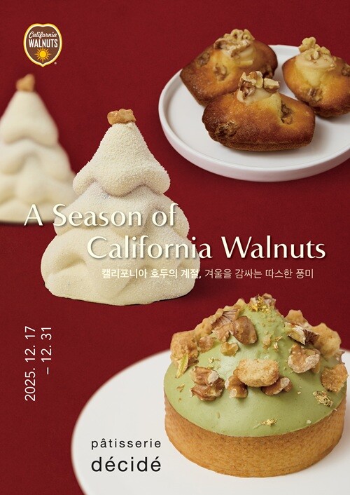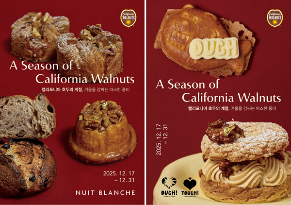 지난 12월 17일부터 31일까지 캘리포니아 호두협회가 서울의 인기 베이커리·디저트 숍과 함께 팝업을 진행한다. 팝업에는 ‘아우치&터치’가 바삭한 호두 크런치와 촉촉한 팥의 조화를 담은 팥 호두 붕어빵, 메이플 프랄린과 크렘 무슬린이 어우러진 호두 파리-브레스트, 그리고 연말 분위기를 담은 호두 크리스마스 젤라또를 선보인다. ‘뉘 블랑쉬’는 과일과 호두가 어우러진 사워도우, 시나몬과 호두의 조화가 돋보이는 호두 스티키번, 그리고 겨울 한정 호두 퀸아망을 준비했다. ‘파티스리 데시데’에서는 호두 풍미를 극대화한 케이크 나는 호두나무, 말차와 카라멜이 어우러진 호두 언덕, 그리고 호두의 따뜻한 풍미가 느껴지는 호두 마들렌을 소개한다.
