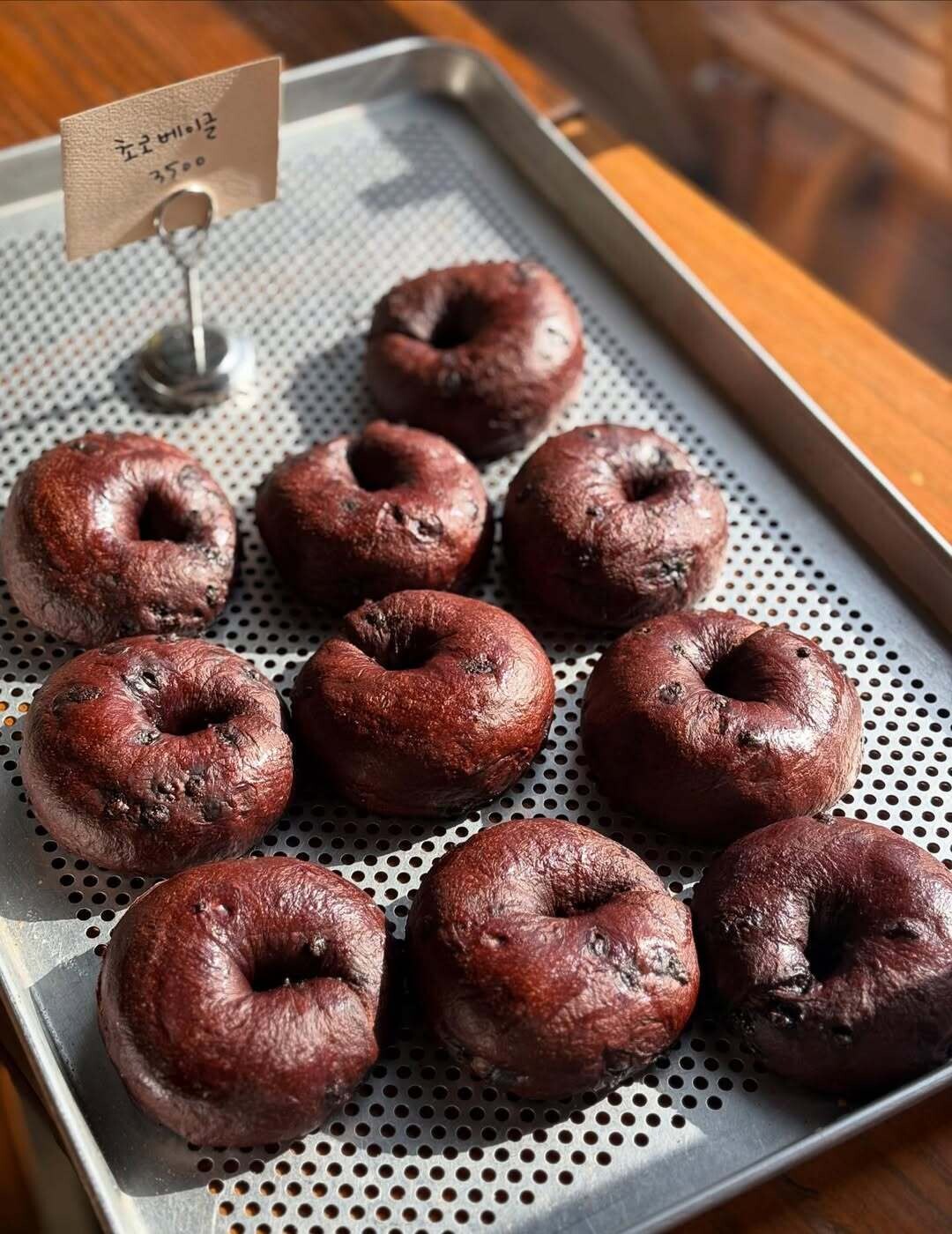 윤기가 흐르는 진한 다크 초콜릿 색의 베이글 사이사이 초코칩이 빼꼼히 등장한다. 한입 베어 물면 베이글 특유의 쫄깃한 식감이 살아 있고, 초콜릿 칩이 씹히면서 초콜릿의 적당한 당도가 기분 좋게 퍼져 나간다. 입안 가득 쌉싸름함과 달콤함이 균형감 있게 밀고 들어오며, 밀도가 높아 하나만 먹어도 든든해 식사 대용으로 즐기기 좋다.