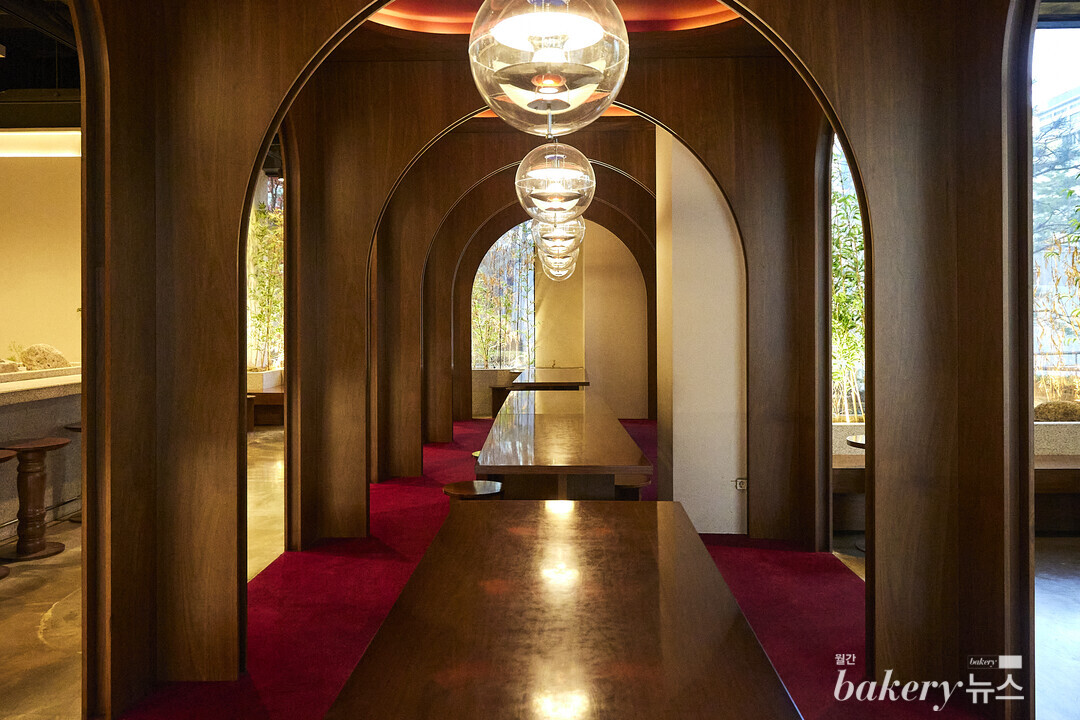 직장인들이 바쁜 걸음을 재촉하는 평범한 회색 건물 1층, 후문 안쪽으로 들어서면 낯선 풍경이 펼쳐진다. ‘赤糖(적당)’ 이라는 간판이 눈에 먼저 들어오는 이곳은 팥 디저트 전문점, ‘을지로 적당(Euljiro Jeokdang)’이다. 입구에서부터 마치 갤러리 같은 느낌이 물씬 풍겨오는데 예스러운 이미지의 양갱을 너무 뻔하지 않게, 젊은 세대들에게 선보이고자 현대적인 느낌의 공간을 꾸몄다. 가장 먼저 카운터에는 과감하게 쇼케이스를 없애고, 시그니처인 양갱에 조명을 설치해 공예품처럼 전시했다. 바로 뒤편은 일본 전통 정원 양식 중, 모래와 돌을 활용한 ‘가레산스이식’ 스타일로 꾸며 자연 속에 있는 듯한 평온한 분위기를 만끽할 수 있으며, 그 뒤에는 유럽식 아치형 통로와 조명을 두어 특유의 묵직하면서 차분한 분위기를 완성했다. 덕분에 어디에 앉는지에 따라 색다른 분위기 속에서 팥 디저트를 즐길 수 있다.