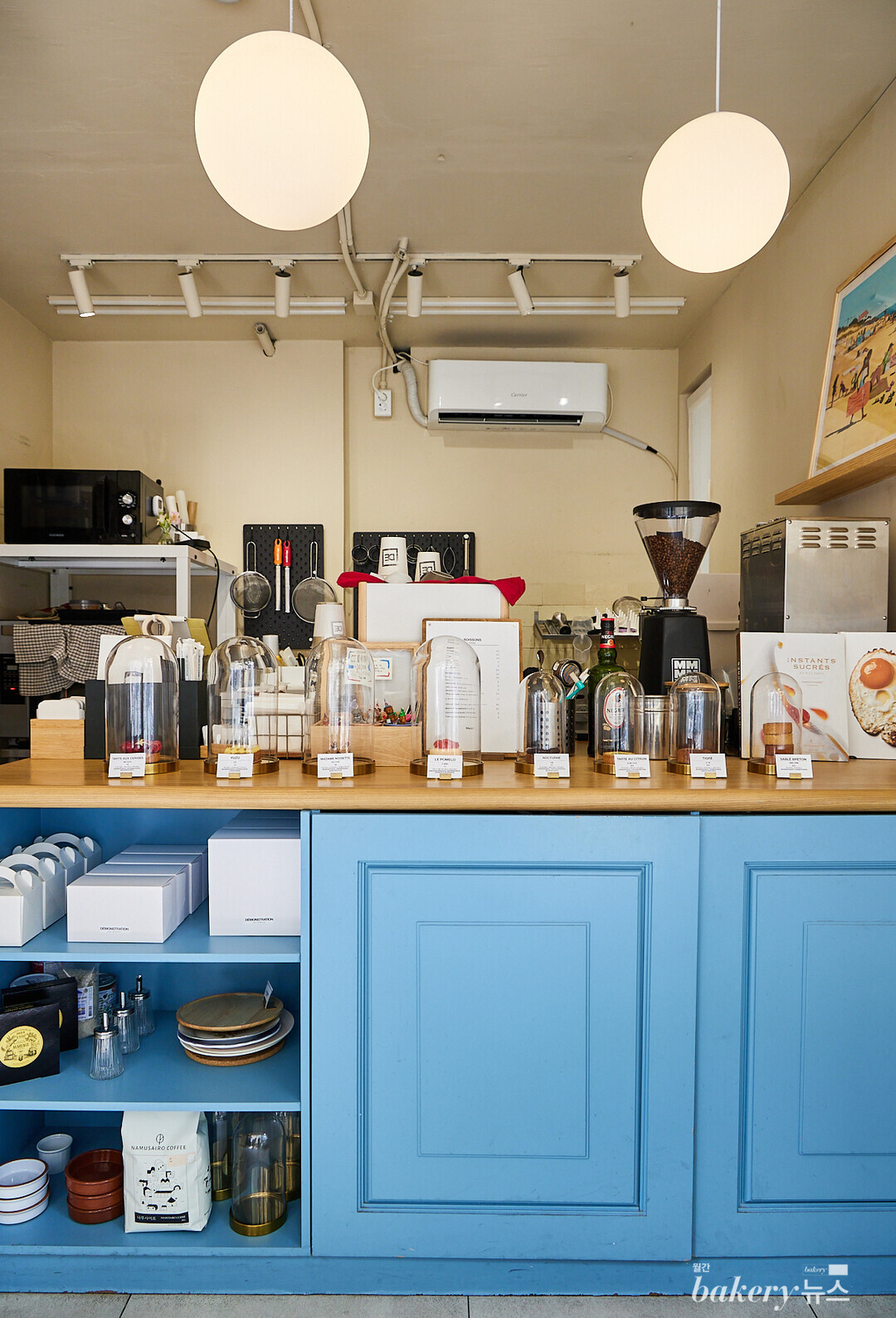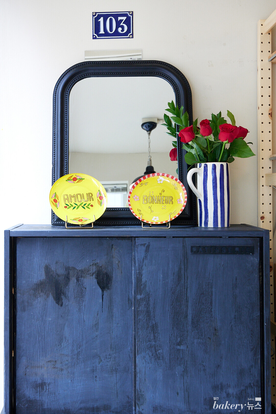 이러한 메시지는 내부 인테리어에도 녹아 들어 있다. 프랑스어와 한글로 번갈아 적힌 제품명과 그 앞에 끼워진 ‘EPUISE(품절)’라는 붉은색 카드, 그리고 파리 건물의 지붕 색으로 자주 쓰이는 파란색을 연상시키는 색상의 수납장과 숫자 ‘103(두 대표가 데몽스트하씨옹의 시작을 꿈꾸었던 파리의 거주지 주소)’이 적힌 빈티지 표지판은 프랑스 문화를 상징하는 기물들로 활용돼 프렌치 디저트가 파생된 곳의 가치를 진정으로 수용하는 태도가 묻어난다.