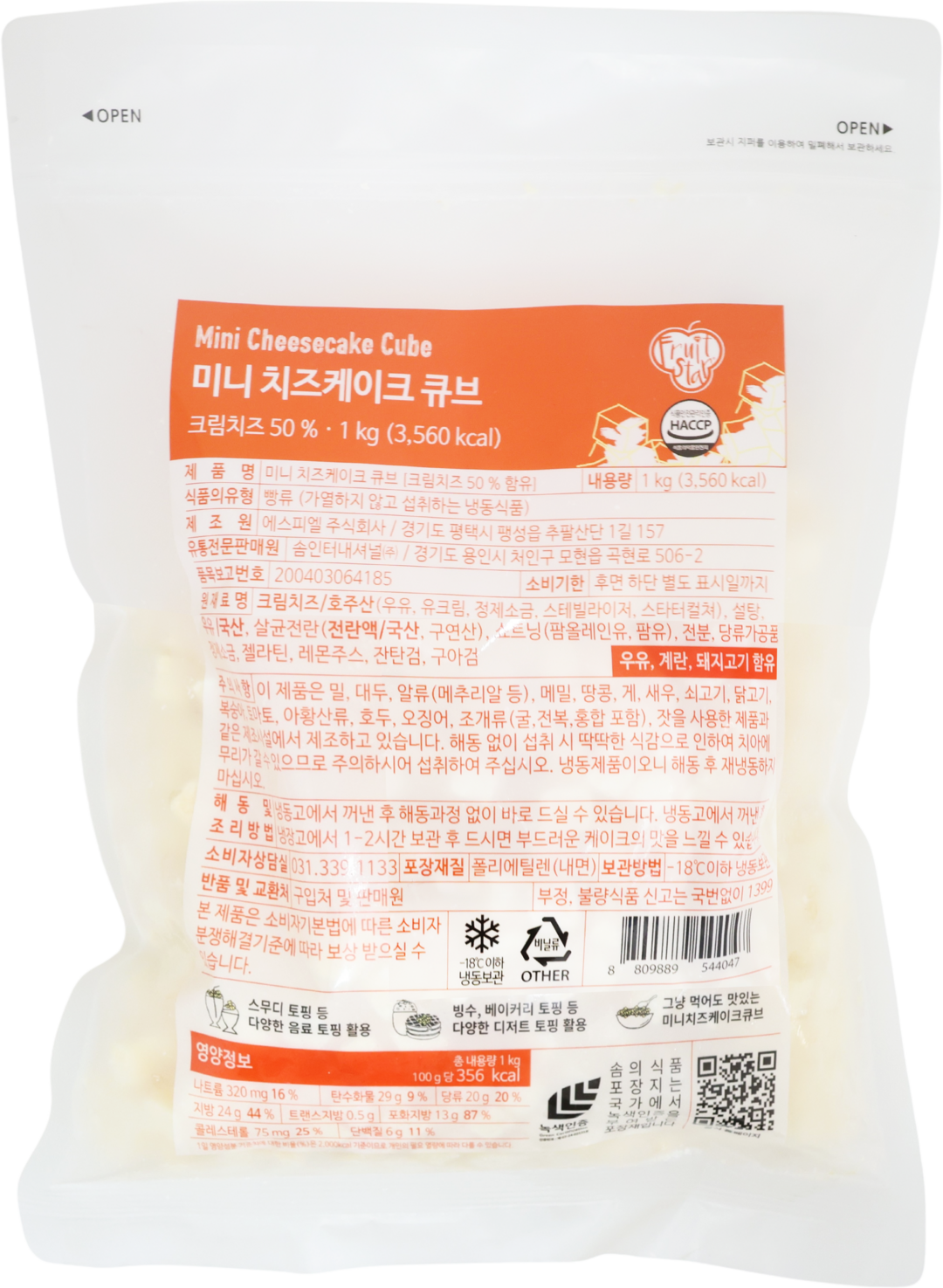 솜 인터내셔널에서 각종 음료, 빙수, 베이커리 제품에 토핑으로 활용 가능한 ‘미니치즈케이크큐브’를 출시했다. 호주산 크림치즈가 50%나 함유되어 진하고 꾸덕한 치즈케이크 맛을 그대로 즐길수 있어, 토핑이 아닌 간식으로 활용하기에도 좋다. 지퍼백 패키징으로 보관이 편리하며, 제품끼리 붙지 않고 한 알 한 알 떨어져 있어 업장에서 바로 활용하기에도 매우 간편하다는 특징이 있다.