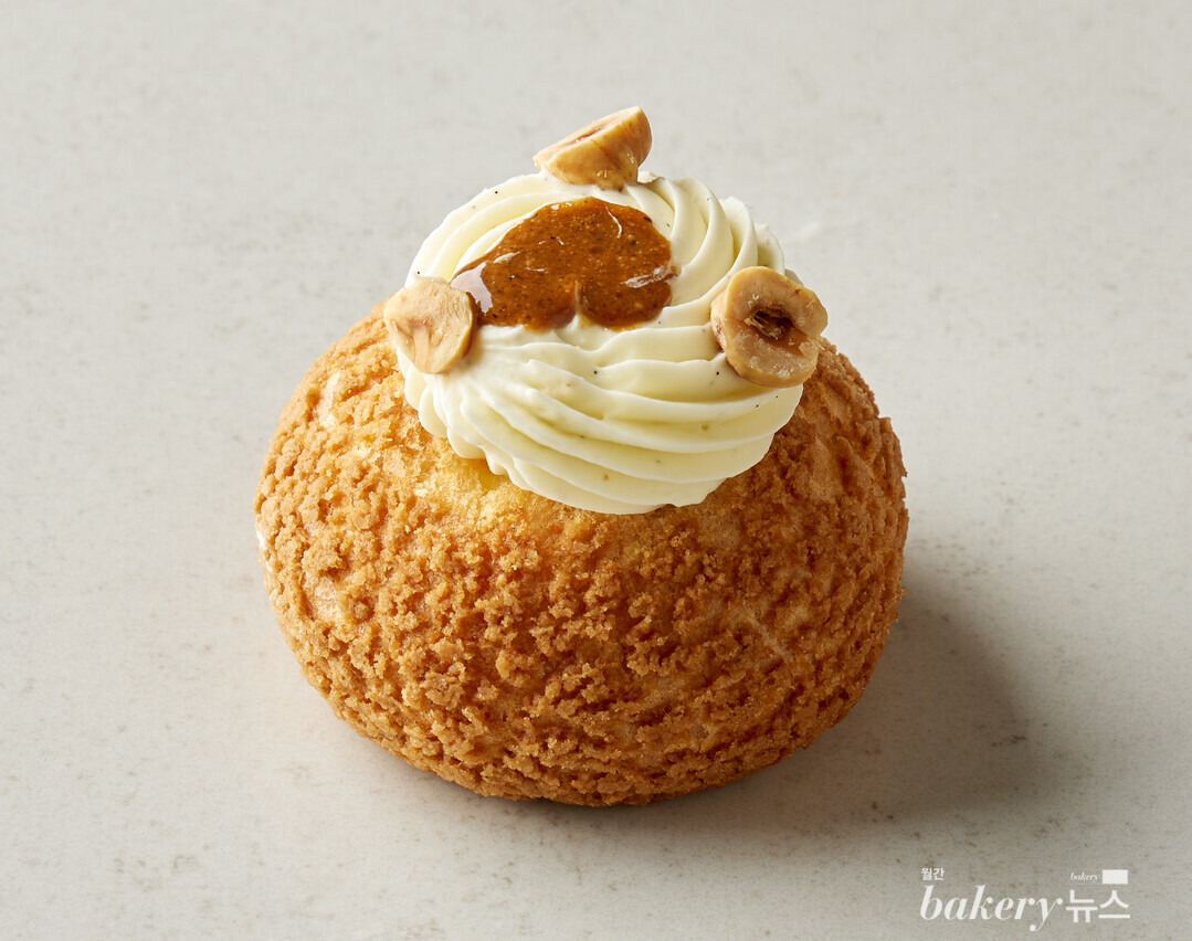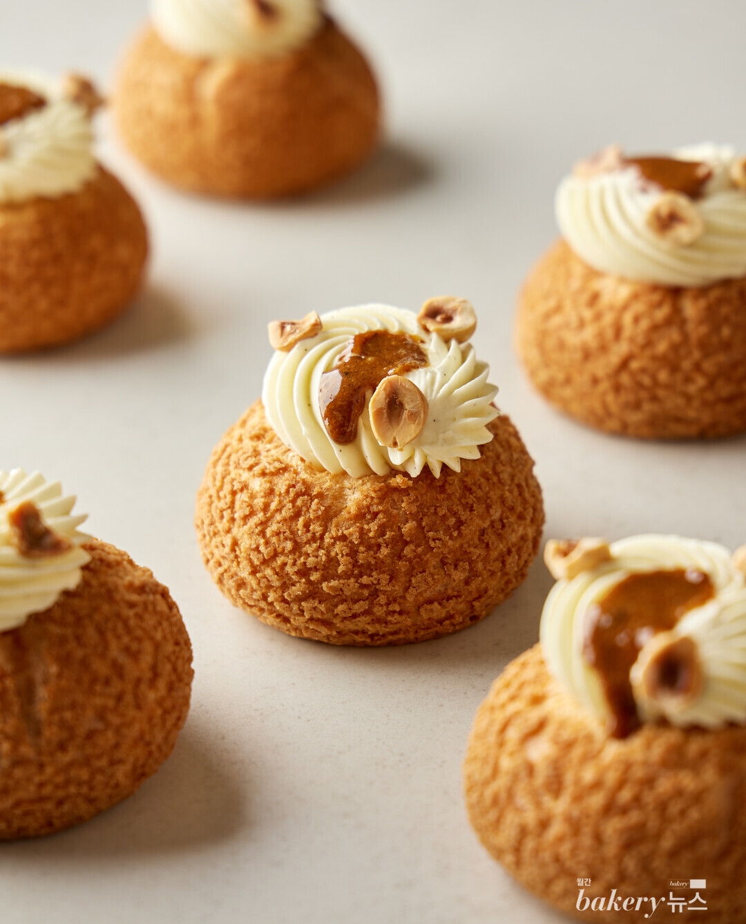 6 ⑤의 윗부분을 살짝 자르고 안에 바닐라 크림, 캐러멜을 짠 후 867번 깍지를 이용해 바닐라 크림을 파이핑한 다음 헤이즐넛 프랄린을 짠 뒤 구운 헤이즐넛 1/2 3개를 올려 마무리한다