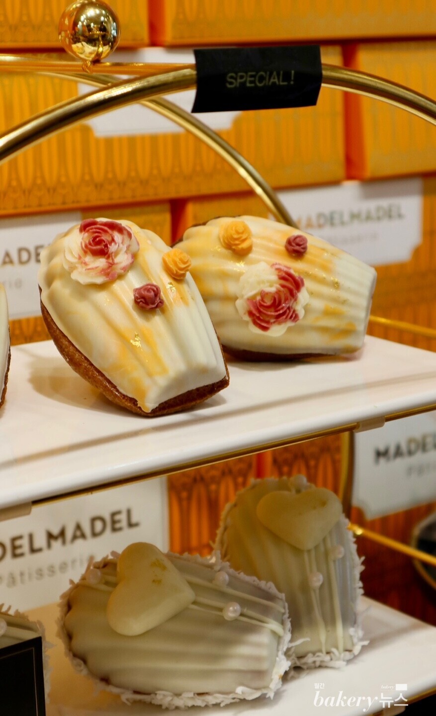 에 자그마한 마블 초콜릿 장미와 금박이 올라가 있다. 모든 마들렌의 배꼽이 한껏 올라와 풍부한 부피감을 자랑하며 퐁신퐁신한 식감이 매력적이다. 특히 캐러멜이나 잼, 커스터드 등 마들렌에 들어가는 부재료를 전부 직접 만들어 남다른 풍미를 느낄 수 있다. 또 시즌마다 그에