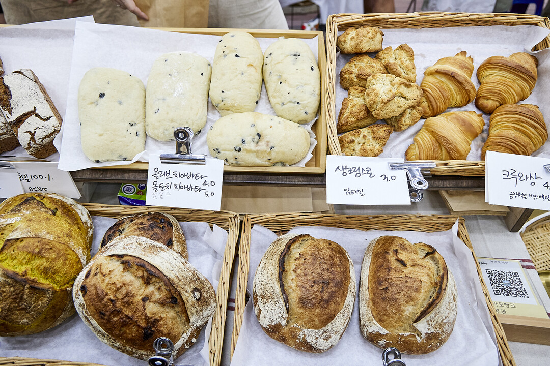 우리밀로 만든 빵이라면 흔히 식사용 통밀빵을 떠올리기 쉽지만, 이번 햇밀장에는 캄파뉴, 바게트와 같은 하드 계열빵을 비롯해, 스콘, 피낭시에, 초콜릿, 페이스트리, 젤라또 등으로 재탄생한 우리밀 제품들을 만나볼 수 있었다. 작업자 팀 중 한 곳인 ‘베지앙’은 캄파뉴와 같은 하드빵은 물론 백강밀로 만든 비건 페이스트리를 선보여 주목을 받았다. 김아윤 오너 셰프는 “햇밀장을 통해 소비자에게 베이커리에 우리밀을 사용하는 의의에 대해 환기해 드리고, 이점에 관해서도 이야기할 수 있어 뿌듯합니다.”라고 전했다. 이 외에도 빈투바 초콜릿 전문점 ‘카카오다다’에서 통밀 100% 검정밀을 사용해 완성한 햇밀 시즌 한정 ‘햇밀 빈투바’를 소개했으며, 젤라또 전문점 ‘델레떼’에서는 아리흑밀을 이용해 ‘아리흑 젤라또 모니카’를 판매했다. ‘우리집 젤라또’는 MZ세대에게 인기가 많은 디저트 품목인 와플과 티라미수에 백강밀을 적극적으로 활용하며, 긴 대기 줄이 생기기도 했다. 경주 핫플 맛집으로 오픈 초기부터 다양한 우리밀 제품을 소개해 온 ‘월정제과’ 부스 역시 제품을 구입하려는 사람들로 북적였다. 월정제과는 식사빵부터 구움과자까지 폭 넓은 제품군을 소개했으며, 특히 우리밀로 만든 베이글이 많은 사랑을 받았다.
