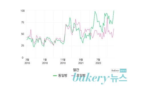 통밀빵과 호밀빵은 건강상의 이유 때문에 중장년층, 혹은 글루텐프리 족들이 대체제로 선택하는 소비 경향이 짙었다. 그러나 최근 MZ세대 사이에서도 곡물빵이 인기를 끌고 있다. 건강 키워드에 대한 관심이 전 연령대로 확산하면서 맛과 건강을 동시에 잡을 수 있는 식품이 주목받고 있기 때문이다. 네이버에서 ‘통밀빵’과 ‘호밀빵’ 키워드 검색량이 2016년 3월부터 2025년 2월까지 아래 그래프와 같이 우상향 곡 선을 그리는 것을 확인할 수 있다.