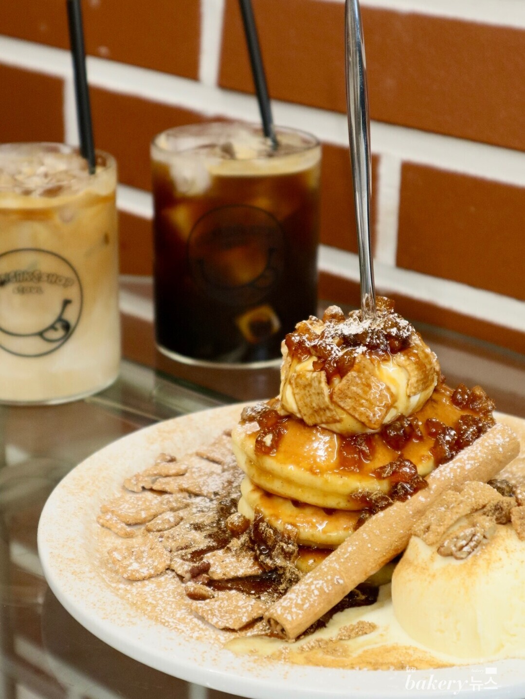 클래식한 납작 팬케이크를 찾는다면 이곳, ‘팬케이크 샵 가로수길점’을 방문하자. 어딘가 친근한 분위기의 붉은 벽돌 인테리어 속 더 친근한 사장님이 반갑게 맞 이해준다. 팬케이크샵은 이미 알 사람들은 다 알만큼 두터운 인지도를 자랑한다. 힙한 무드, 먹음직스러운 팬케이크, 푸짐한 양, 훌륭한 맛의 디저트와 그에 어울리는 커피까지. 한 번도 안 온 사람은 있어도 한 번만 온 사람은 없다고 한다. 여러 종류의 팬케이크 중 시그니처인 ‘애플 시나몬 크런치 팬케이크’를 먹었는데, 피칸과 시나몬 크런치가 식감에 재미를 주고 애플 시나몬 시럽이 팬케이크를 더 촉촉하고 달콤하게 만들어줬 다. 무엇보다도 바닐라 아이스크림이 모든 맛을 시원하게 중화하는 신의 한수였다.
