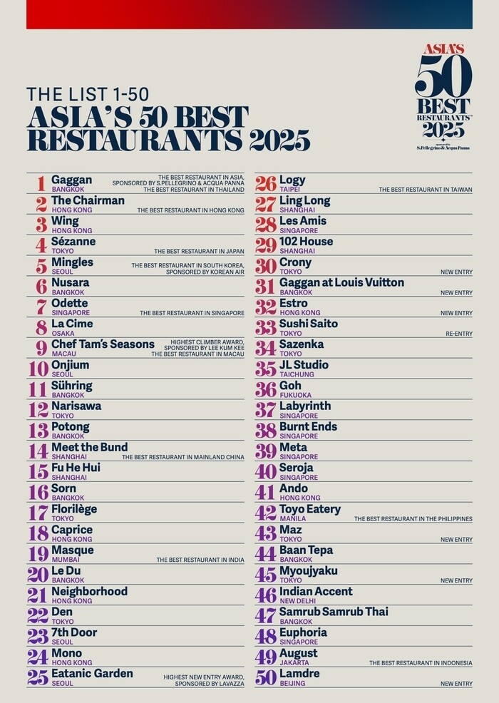 ‘아시아 50 베스트 레스토랑(Asia’s 50 Best Restaurants, 이하 A50B)’은 미쉐린 가이드와 함께 세계 최고 레스토랑을 선정하는 ‘월드 50 베스트 레 스토랑’의 아시아 지역 버전으로, 아시아 미식의 정수를 가리는 권위 있는 시상식이다. 순위는 ‘아시아 50 베스트 레스토랑 아카데미(Asia’s 50 Best Restaurants Academy)’의 투표를 통해 결정되며, 아카데미는 음식 전문 기자, 평론가, 셰프, 레스토랑 운영자, 지역 미식 전문가 등 350명 이상의 업계 인사로 구성된다. 이 과정에서는 성별 균형 또한 철저히 고려된다.