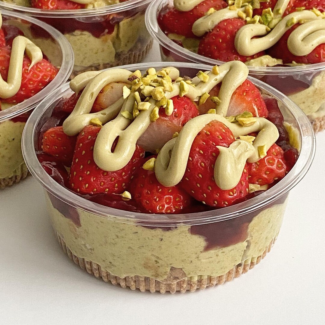 고소한 피스타치오와 쫀득한 피스타치오 몽떼 크림, 바삭한 아몬드 크럼블이 1차적으로 균형 잡힌 맛을 낸다. 몽떼 크림에도 생크림이나 크림치즈가 아닌, 마스카르포네 크림을 사용해 맛의 깊이를 더했다. 그 위로 딸기 콩포트와 새콤달콤한 딸기가 더해지며 디저트의 정점을 찍는다. 편하게 떠먹을 수 있도록 컵에 담겨서 제공되니 어디서나 간편하게 즐겨 보자.