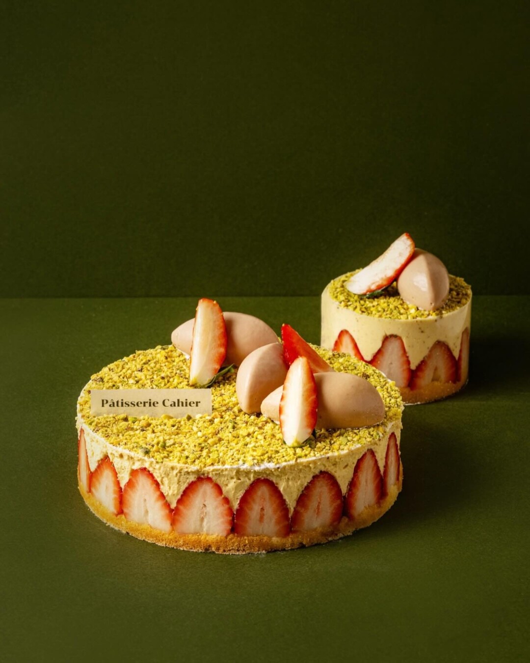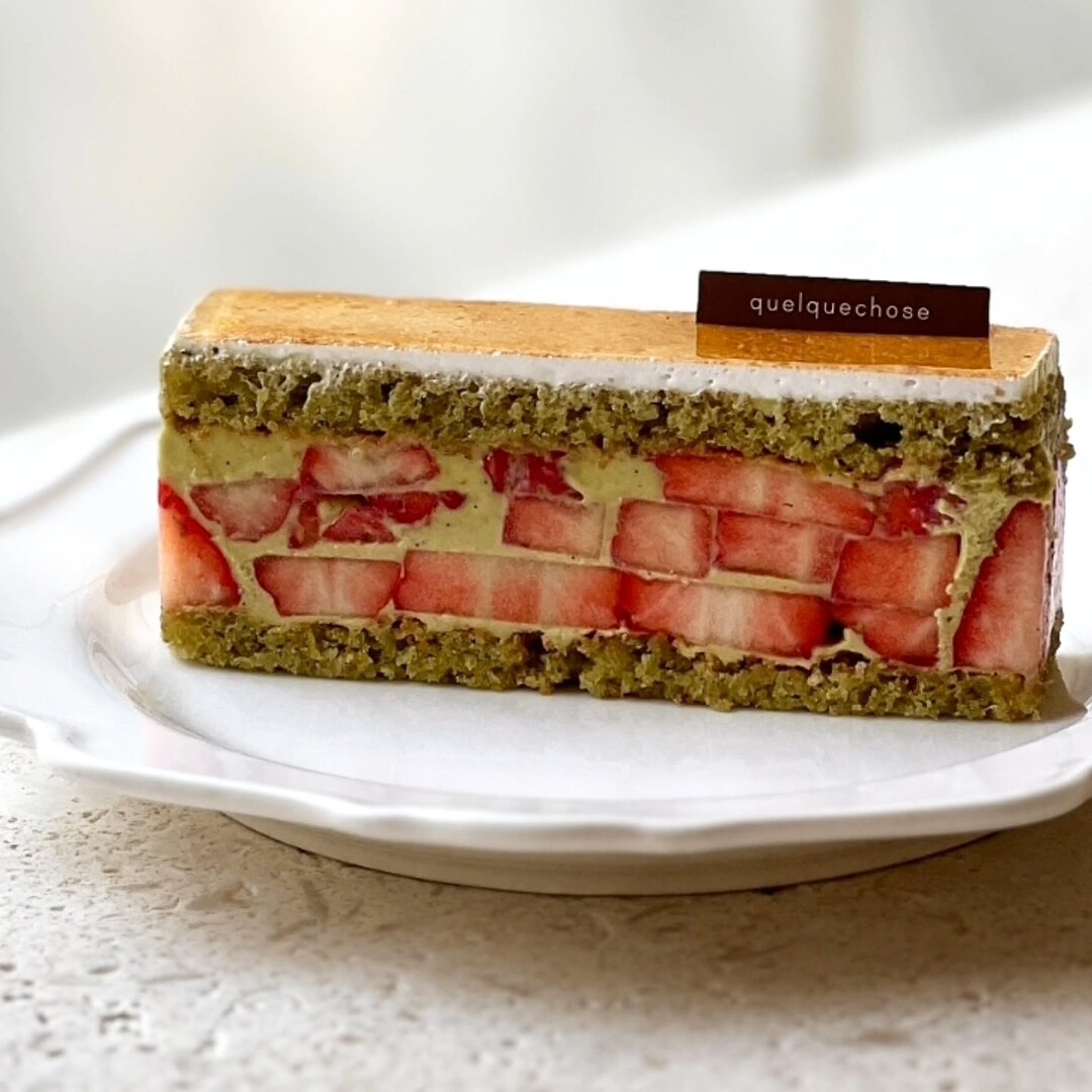 ‘껠끄쇼즈’의 대표 제품 중 하나인 ‘클라시크’. 층층이 자리한 딸기와 피스타치오의 조합이 한눈에 들어온다. 키르슈 바닐라 글레이즈, 이탈리안 머랭, 피스타치오 다쿠아즈, 피스타치오 무슬린 크림, 딸기로 구성되어 있다. 촉촉하면서도 쫀득한 다쿠아즈 사이로 부드러운 무슬린 크림과 상큼한 딸기의 조합은 간결하면서도 최고의 맛을 선물한다.