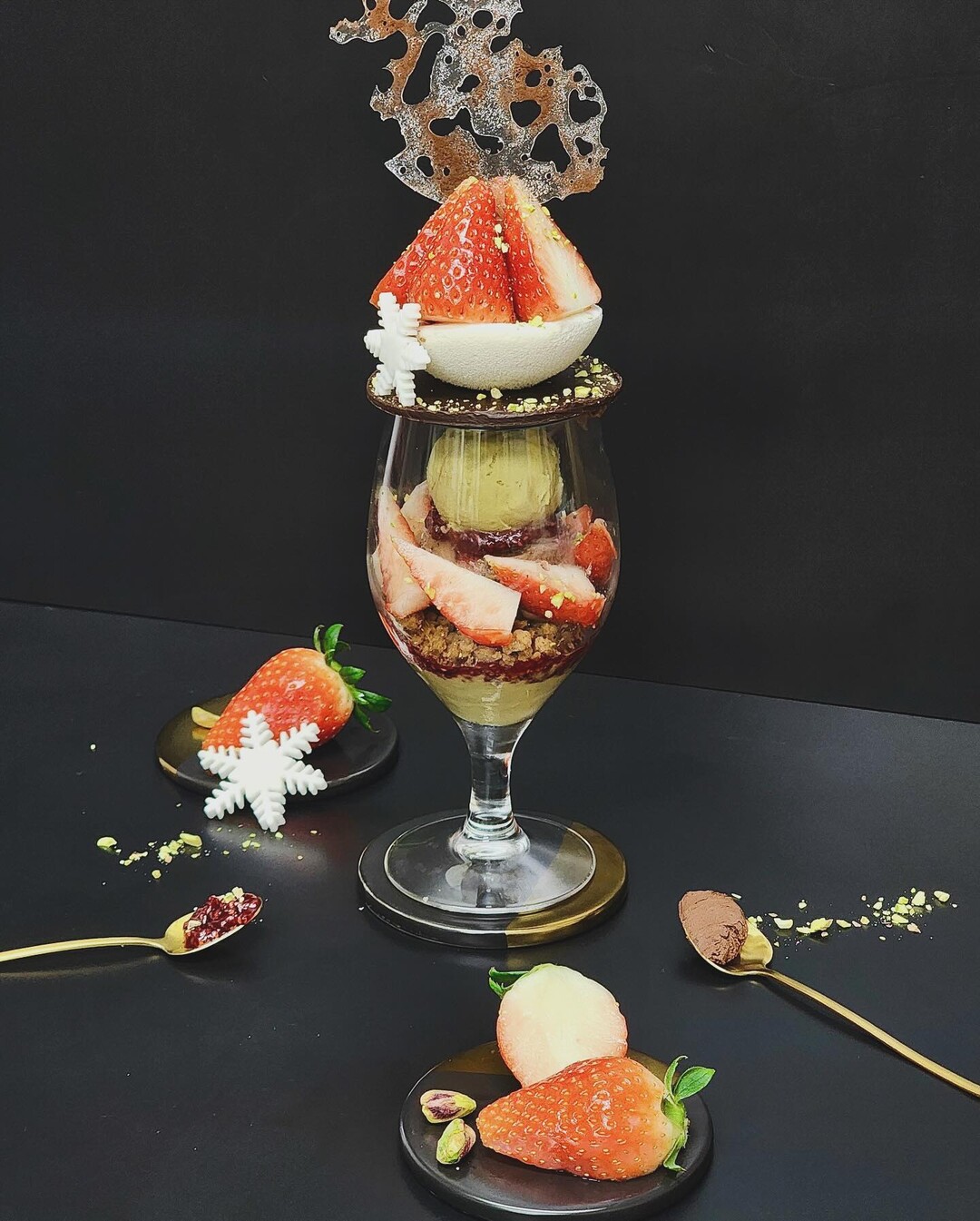딸기와 피스타치오의 조화로운 맛을 파르페에 담았다. 진한 맛과 향이 도드라지는 설향 딸기, 고소함 가득한 피스타치오 아이스크림, 라즈베리 소스, 진한 다크 초콜릿 아이스크림이 한데 어우러져 겨울에 어울리는 맛을 낸다. 여기에 바삭한 쿠키 크럼, 머랭 볼, 초코 커스터드 크림, 초코 사탕 튀일 등이 맛과 식감을 더하니 달콤한 2월을 즐기기에 충분하다.