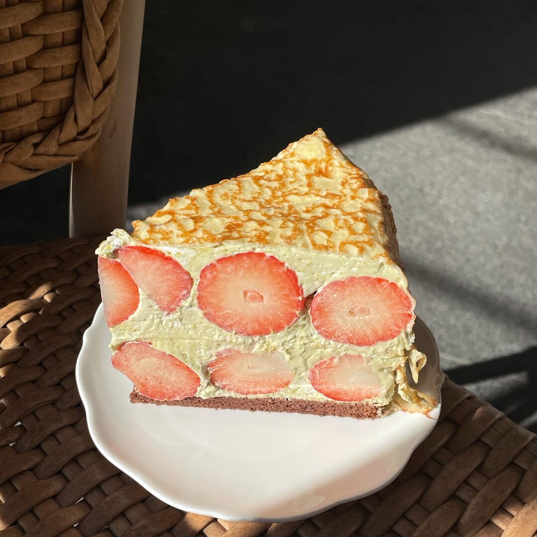 크레이프 가운데 박힌 큰 딸기 단면이 침샘을 자극한다. 얇은 크레이프 아래 넘칠 듯 가득 채워진 피스타치오 크림은 고소하면서도 묵직한 맛을 낸다. 딸기 본연의 달콤함을 느낄 수 있도록 당도를 낮춘 구성으로, 누구나 부담 없이 즐길 수 있다. 부드러우면서도 쫀득한 크레이프부터 모든 요소를 한입에 떠먹어 보길 추천한다.
