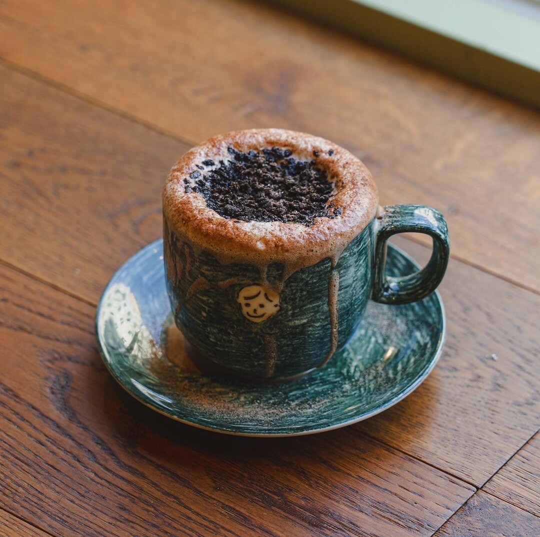 우유에 다크 커버추어 초콜릿과 코코아 파우더가 통으로 들어간다. 진하고 씁쓸한 초콜릿 베이스가 차가운 생크림과 만나 단맛이 더해져 마치 아이스크림을 연상케 한다. 그 위를 초콜릿이 장식해 핫초코를 완성한다. 먼저 티스푼으로 크림을 떠서 달콤함을 즐긴 후 남은 크림과 초코 베이스를 음미하면 진한 초콜릿의 풍미를 느낄 수 있다.