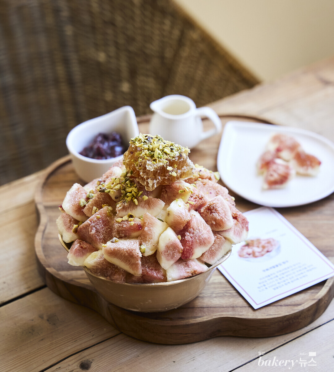 우유 얼음 위에 한가득 올라간 무화과는 얼핏 보기에도 상당한 양을 자랑한다. 최상급 무화과만을 선별해 제공하니 먼저 과일을 맛본 후 빙수를 먹어 보자. 지리산 뱀사골의 깊은 산속에서 채밀한 벌꿀집도 함께 제공되니 꼭 곁들여 먹어 보길.
