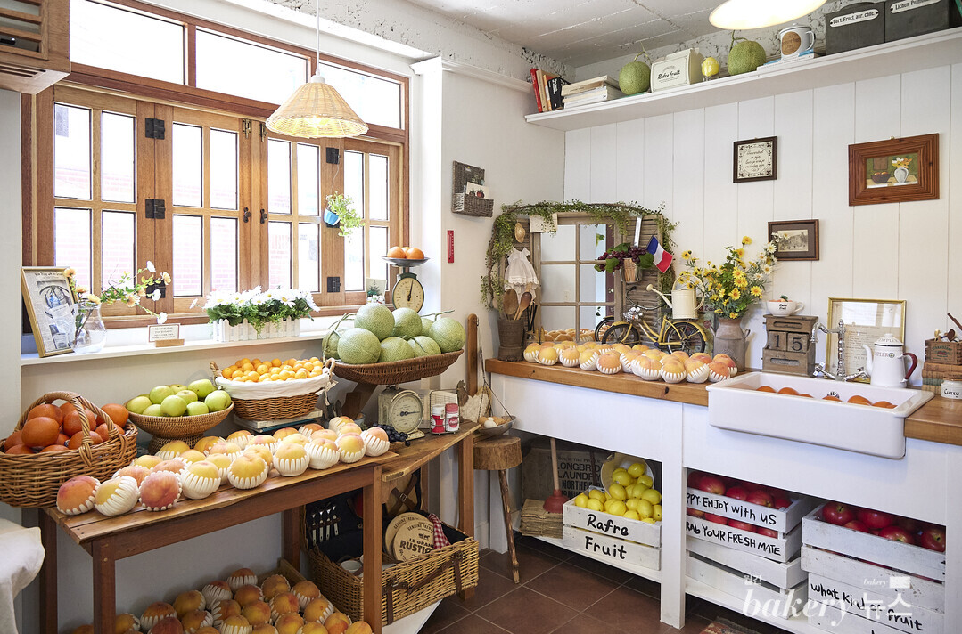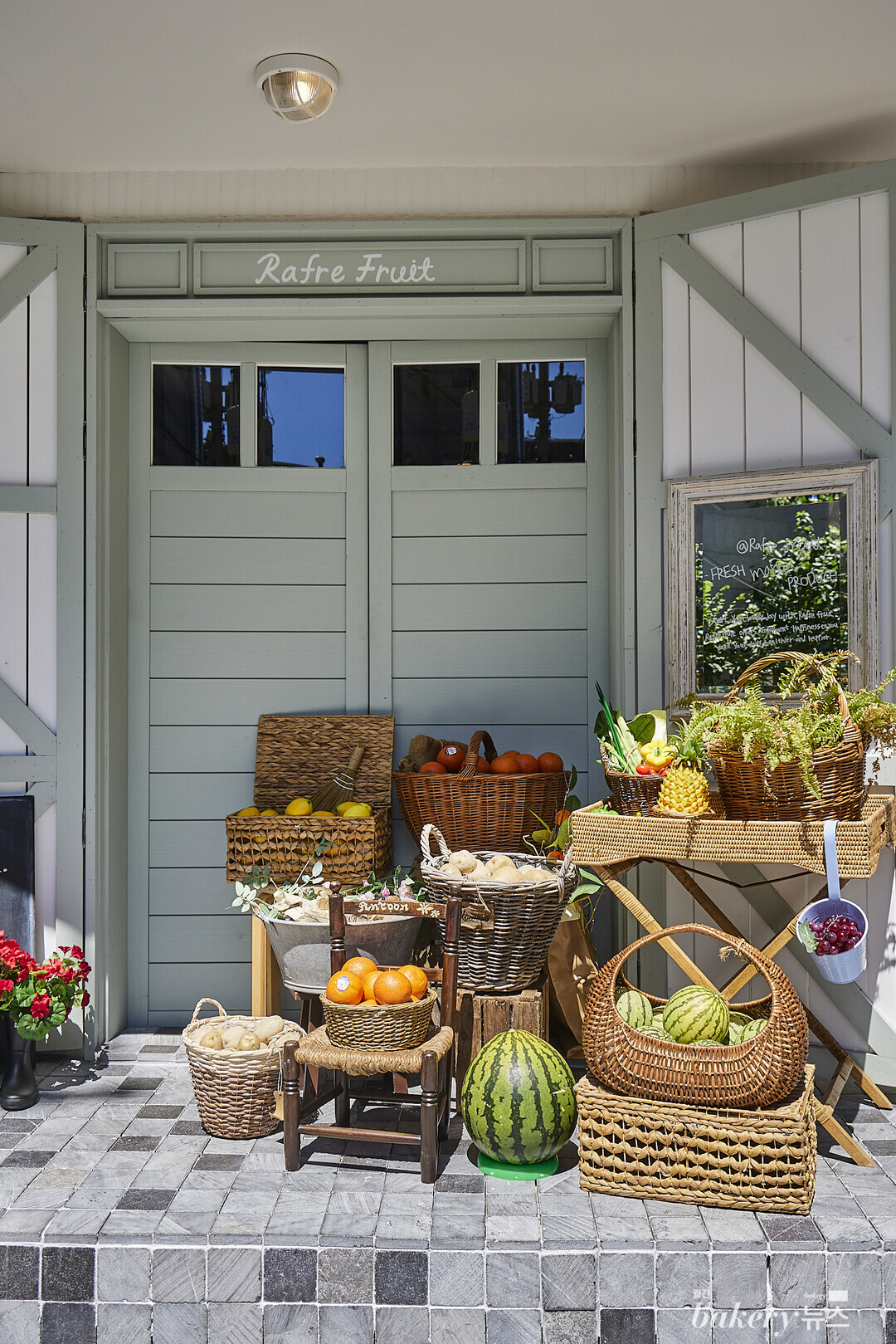 라프레플루트 서촌점은 2층으로 나뉘어 있는데 1층엔 다양한 과일을 디스플레이해 과일 가게처럼 꾸몄다. 형형색색의 과일들이 눈을 즐겁게 하는데 실제 매장에서 사용 하는 복숭아를 이곳에서 후숙하여 사용한다고. 생과와 가짜 과일 모형이 섞여 있으니 자세히 들여다보며 비교하는 재미 또한 놓칠 수 없다. 또 2층엔 프랑스 소도시의 한가정집 분위기를 담기 위해 테이블을 빡빡하게 채우지 않고 비워 최대한 편안한 분위 기를 완성했다. 흰 벽지에 원목 테이블과 의자, 창틀은 실제 가정집이라고 해도 믿을수 있을 정도의 싱크로율을 자랑한다. 특히 플랜테리어에 가장 많이 신경 썼다고 하는 데, 곳곳에 자리한 화려한 색감의 조화는 프랑스 무드를 완성시킨다. 햇살이 들어오는 창가에 앉으면 바깥으로 붉은색 꽃들이 보이며 순식간에 프랑스로 여행을 떠나온 듯한 기분을 느낄 수 있으니, 이곳에 앉아 디저트를 즐겨 보는 것을 추천한다.