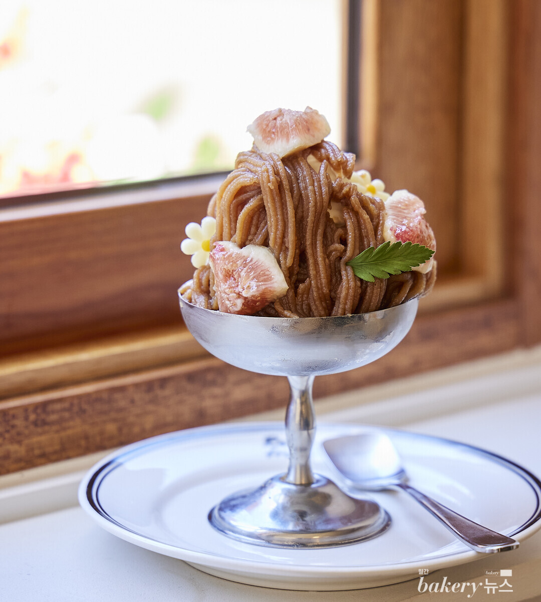 바삭한 초코 그래놀라 위에 상큼한 요거트 아이스크림을 올렸다. 그리고 위에 밤 페이스트를 짜 올려 몽블랑을 연상케 한다. 중간중간 더해진 달콤한 무화과가 밤과 어우러 지며 매력적으로 다가온다.