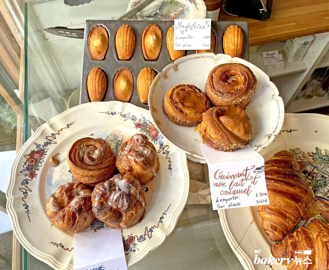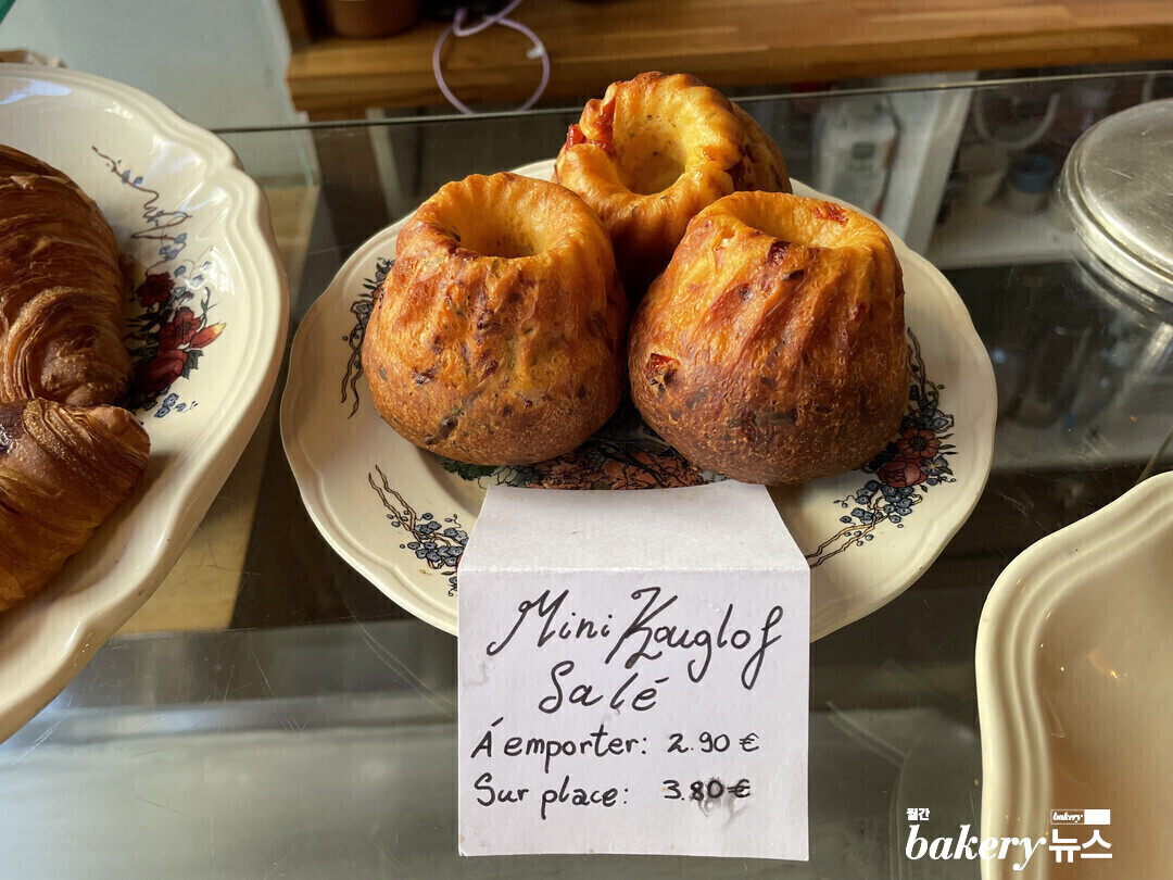 한편 방문 시 맛봤던 커피와 카다멈이라는 낯선 조합이 흥미로운 크루아상은 가득 충전된 부드럽고 쫀득한 크림이 인상적이었다. 달지 않으면서도 향긋한 카다멈의 향이 이국적이고도 상쾌하게 퍼지며, 계속해서 한 입 더 먹고 싶게 만들었다. 카페 미라벨의 모든 비에누아즈리는 전부 홈메이드인데, 크루아상 자체의 맛도 소박하면서 친근해 따뜻한 느낌을 줬다. 구겔호프는 파리에서 쉽게 볼 수 없는데다, 세이버리 버전이라는 점에서 더 반가웠다. 선드라이드 토마토의 단맛과 허브의 풍미, 브리오슈 특유의 부드러운 식감이 어우러져 부담없이 가볍게 즐길 수 있었다.