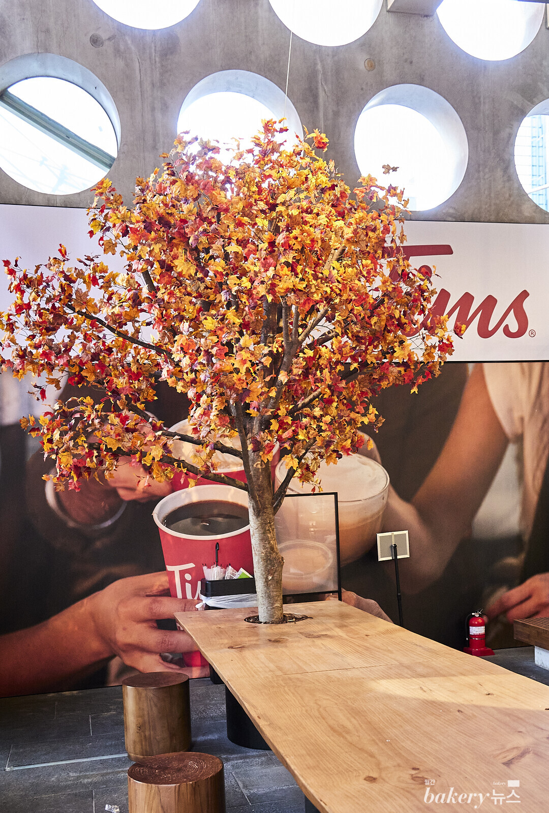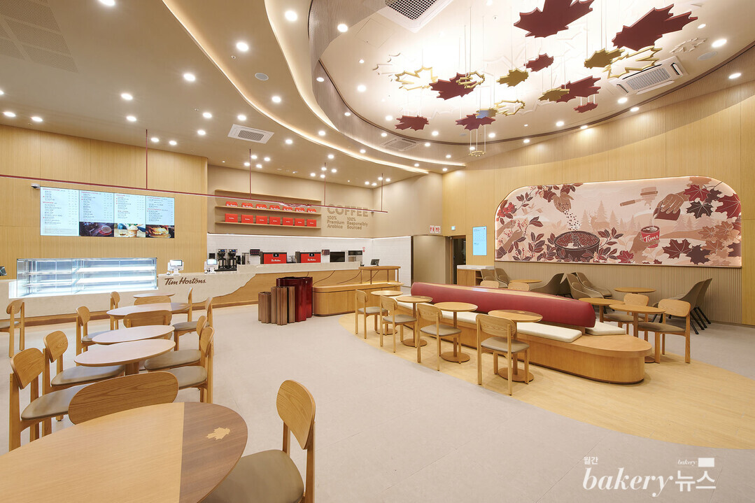 유기적인 곡선 디자인에 채워진 밝은 나무 질감의 벽과 단풍의 붉은 색감이 자연 친화적이고 따뜻한 느낌을 준다. 매장 곳곳에는 캐나다를 상징하는 요소인 단풍이 스며들어 있다. 또 테라스 자리에 굳건히 위치한 커다란 단풍 나무, 내부 천장에 매달아 놓은 단풍잎 모양의 아트월로 단풍을 감각적으로 해석했다. 자연 친화적인 공간 디자인 콘셉트를 추구하는 팀홀튼의 철학을 만날 수 있는 공간이다.