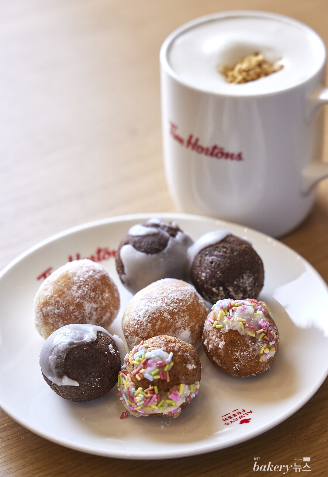 한 입에 들어가는 미니 사이즈 도넛. 허니 글레이즈드 초콜릿 맛, 스트로베리필 맛, 레몬필 맛, 버스데이 맛으로 총 4가지 팀빗을 즐길 수 있다. 메이플 크림과 토핑이 가미된 달콤한 메이플 라떼도 추천한다.