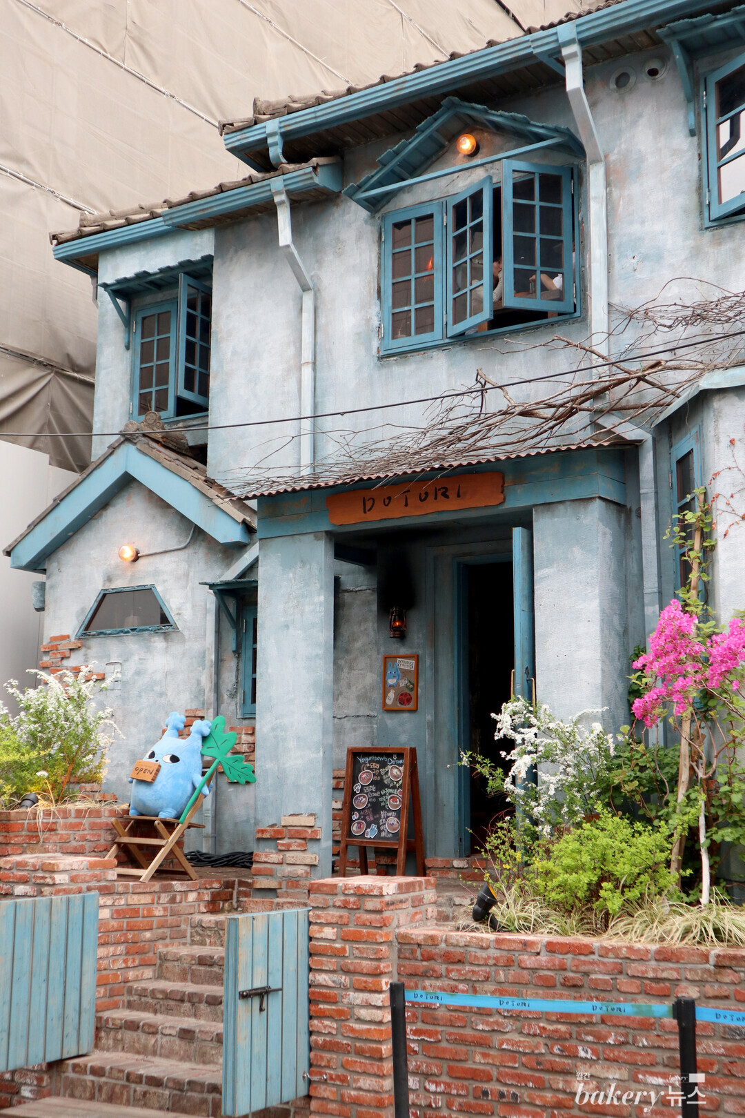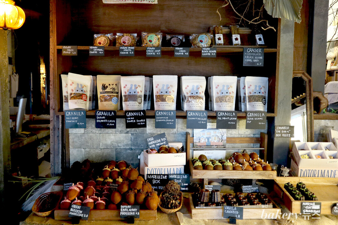 ‘지브리’ 애니메이션이 떠오르는 몽환적인 외관을 가졌다. 그 앞에는 ‘도토리’의 마스코트 인형이 환영하듯이 새침하게 앉아 있다. 분필로 그려진 아기자기한 메뉴판을 지나 내부로 들어가면 어두운 공간이 나온다. 그 안으로 주황빛 조명 아래 애니메이션 속으로 들어온 듯 한 비주얼을 지닌 베이커리류를 만날 수 있다. 마들렌부터 소금빵, 그래놀라, 그릭 요거트, 케이크, 브런치까지 여러 제품군을 즐길 수 있다. 그중 도토리하면 떠오르는 메뉴는 바로 ‘그릭 요거