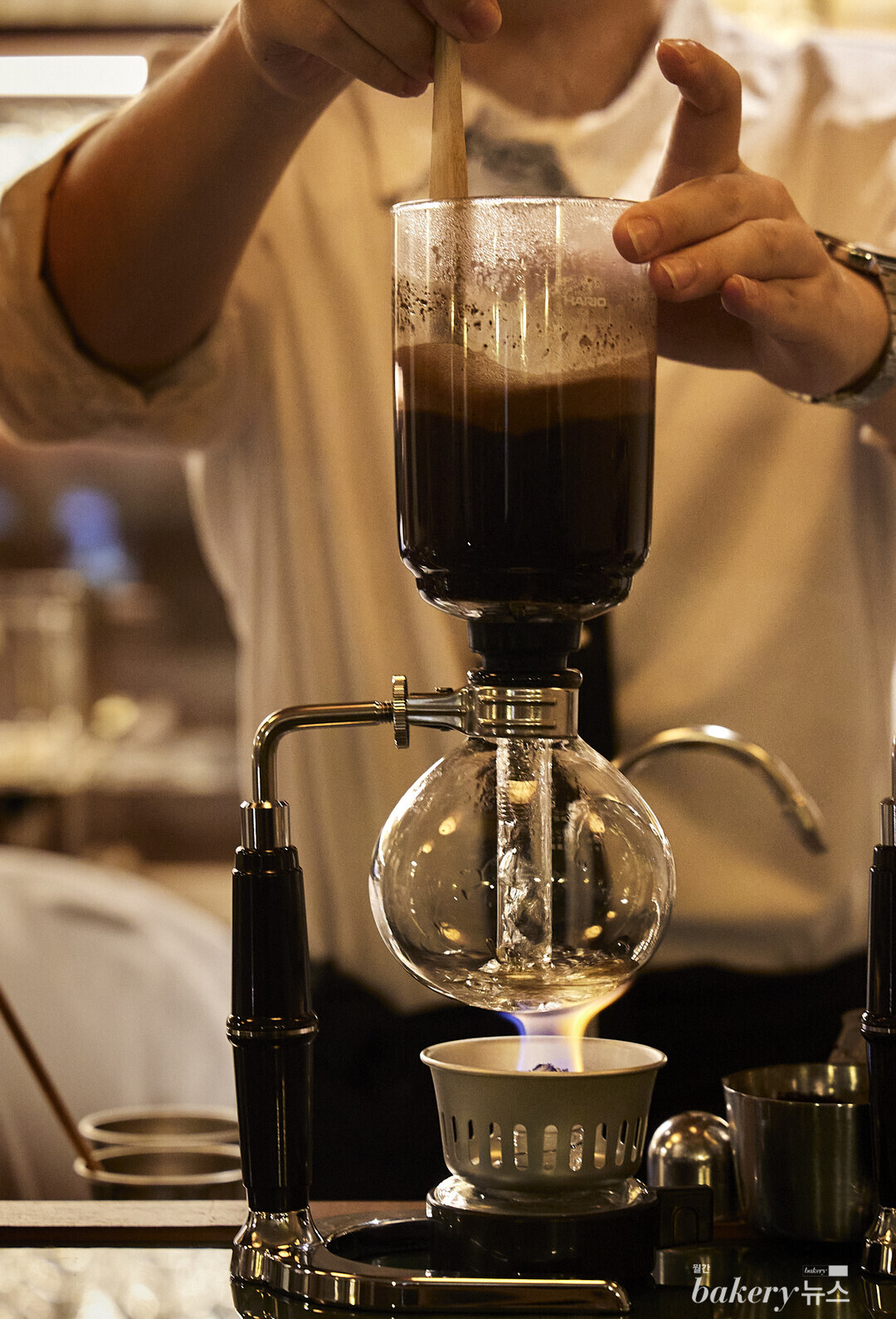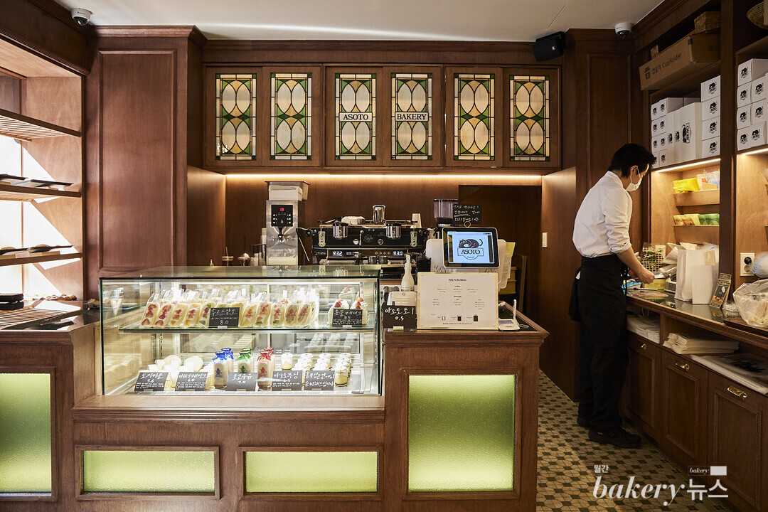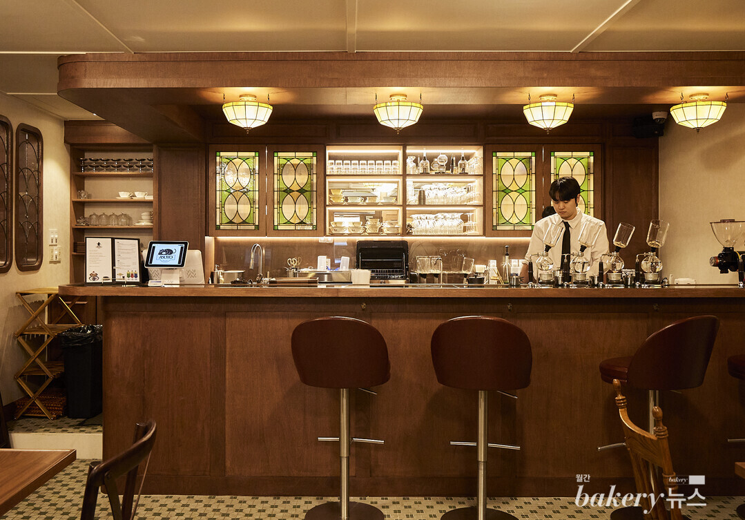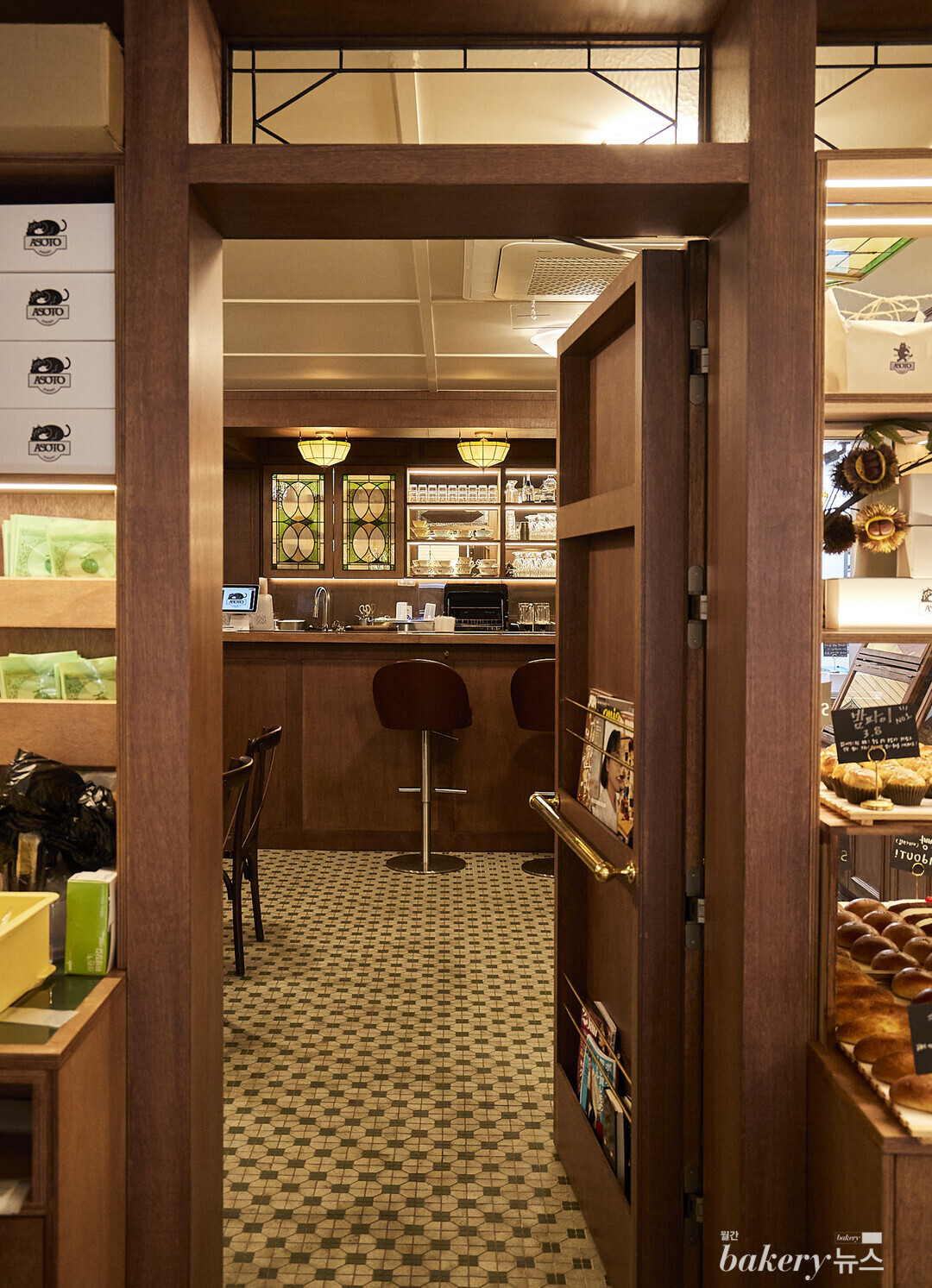 킷사텐의 가장 큰 특징을 꼽으라면 어두운 나무 인테리어를 떠올리는 이들이 적지 않을 것이다. 아소토 베이커리 또한 나무를 메인으로 클래식하면서도 따뜻한 느낌을 살리고, 중간중간 스테인드글라스를 적절히 섞어 포인트를 줬다. 여기에 벽은 타일 대신 일본 풍의 벽지를 활용해 마무리했다. 특별한 소품 없이도 커피를 추출하는 도구들, 직원들의 유니폼, 우드톤의 다양한 몰딩들은 일본에 와 있는 듯한 느낌을 준다. 아소토 베이커리의 또 다른 와우 포인트는 바로 매장 중간에 자리한 문이다. 문을 밀면, 사이폰 커피를 내리는 공간과 테이블들이 마치 영화 속 비밀 장소처럼 등장한다. 얼핏 보면 벽으로 보이기도 하는 이문을 넘어가면 새로운 세계가 펼쳐지는 것이다. “매장 식사 고객들이 안쪽에서 공간을 즐길 수 있도록 공간 분리를 했습니다. 온전히 저희가 준비한 메뉴들을 집중해서 맛보고 가셨으면 했어요.” 눈앞에서 사이폰 커피 내리는 과정을 볼 수 있는 바 테이블까지 마련하며 ‘찐’ 킷사텐을 완성했다.