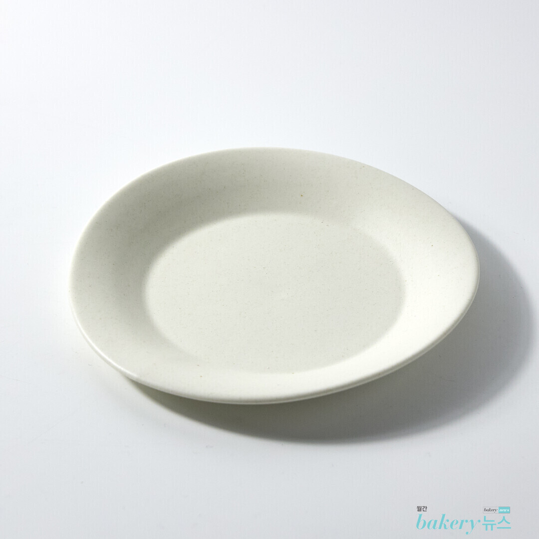 지름 15.5cm×높이 2cm로 심플한 원형의 플랫한 접시다. 약간 오목하게 들어가 있어 소스나 흐름성 있는 크림이 올라가도 안정감 있다. 조각 케이크나 생토노레 같은 슈 디저트를 올리기에도 좋다.