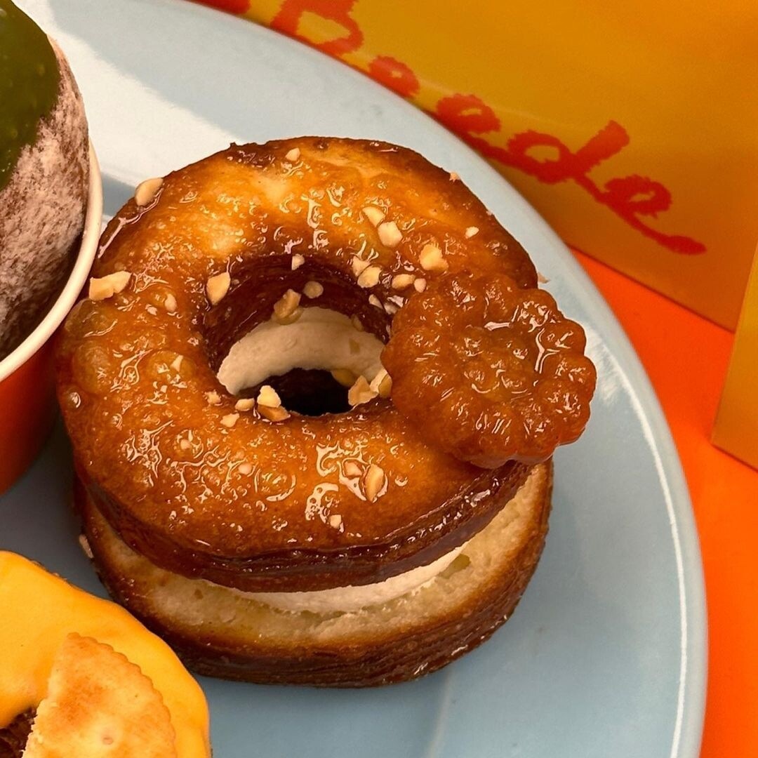크루아상 생지로 만드는 도넛을 뜻하는 크로넛. 크로넛을 메인으로 판매하는 연남동 디저트 카페인 ‘비비드크로넛’이 ‘약과 크로넛’을 선보인다. 겹겹이 쌓인 페이스트리 결 덕에 바사삭 하고 부서지는 식감이 매력적이다. 조청이 듬뿍 묻어 있어 실제 약과를 먹는 듯한 느낌을 느낄 수 있으며 미니 약과와 땅콩이 위에 올라가 포인트를 더한다. 가운데 샌드된 부드러운 크림이 약과의 맛과 잘 어우러진다.