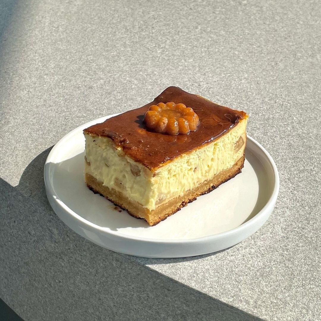 피넛 버터 쿠키 위로 약과가 콕콕 박혀 있는 치즈케이크 ‘약과피넛치쿠케’. 그 위로 직접 만든 조청과 미니 약과를 올려 마무리했다. 처음엔 꾸덕, 치즈케이크로 파고 들 땐 부드럽다가 마지막 피넛 버터 쿠키에선 바삭하게 잘린다. 모든 식감을 온전히 즐기려면 한 번에 푹 떠먹는 것을 추천한다. 부드럽게 흘러내리는 조청까지 완벽한 하모니를 이룬다.