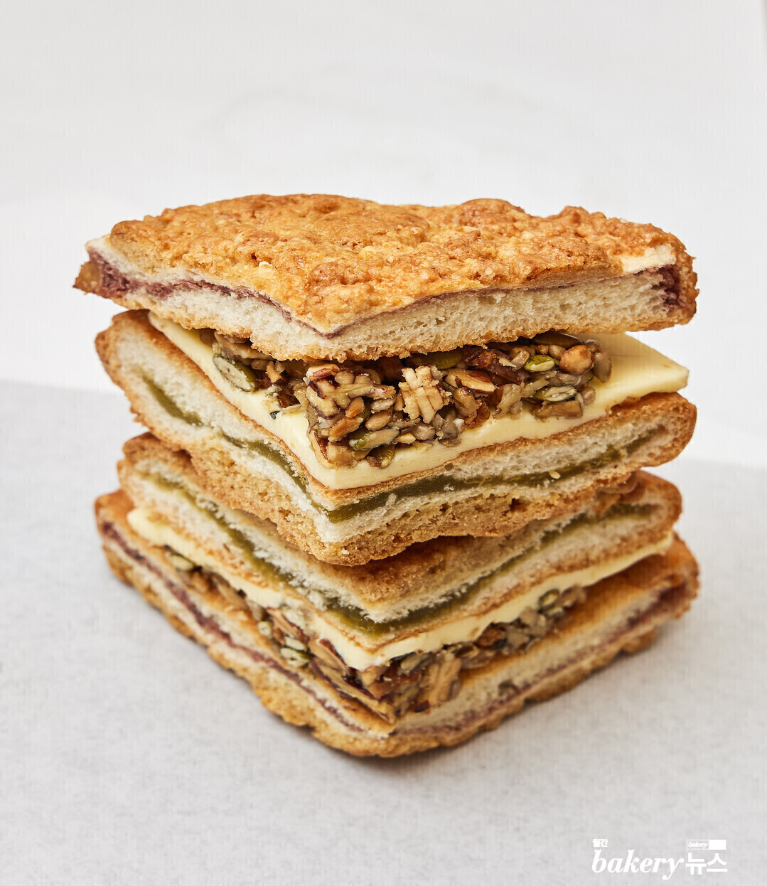 한쪽 빵에는 팥 앙금이, 다른 한쪽에는 완두 앙금이 충전된 맘모스 빵이다. 그 사이로 버터 한 조각, 벌꿀로 만든 청과 함께 버무린 해바라기씨, 아몬드, 호두, 호박씨를 샌드했다. 달콤함과 고소함이 조화를 이루는 맛이다.