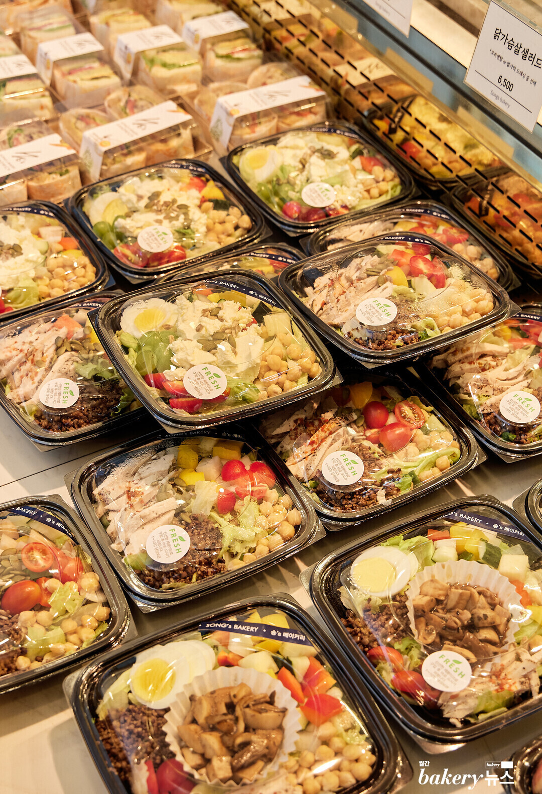 맘모스 빵으로 앙버터를 만들었는데 이것을 4등분 해 부채꼴 모양으로 잘랐다. 짧은 시간에 매대를 스캔하는 고객들이 눈길을 줄만한 비주얼이다. 사보루는 황설탕을 써서 만든 보슬보슬한 황색 카스텔라에 스트로이젤을 듬뿍 올렸다. 딸기잼까지 샌드해 추억을 불러 일으키는 맛이다. 한편 샐러드는 풍성한 양, 저렴한 가격으로 인기가 좋은데 버섯과 닭가슴살, 리코타 치즈를 메인 재료로 한다. 드레싱은 직접 개발한 황금 비율의 오리엔탈과 발사믹 중 기호에 맞게 선택하면 된다. 송스베이커리가 오픈한 3년 전 4월은 코로나19로 인한 사회적 거리두기 정책으로 인해 사업을 시작하기에 힘든 시기였지만 송 셰프는 매장 오픈 타이밍을 놓칠 순 없었다고 회상했다. “할 수 있는 것이라곤 같은 빵이라도 더 정성스럽게 만드는 거였어요.” 그때의 힘들었던 기억이 오늘의 자신을 채찍질 한다는 송용규 셰프는 명절 당일을 제외하곤 매일 6시에 매장에 나와 빵을 굽는다.