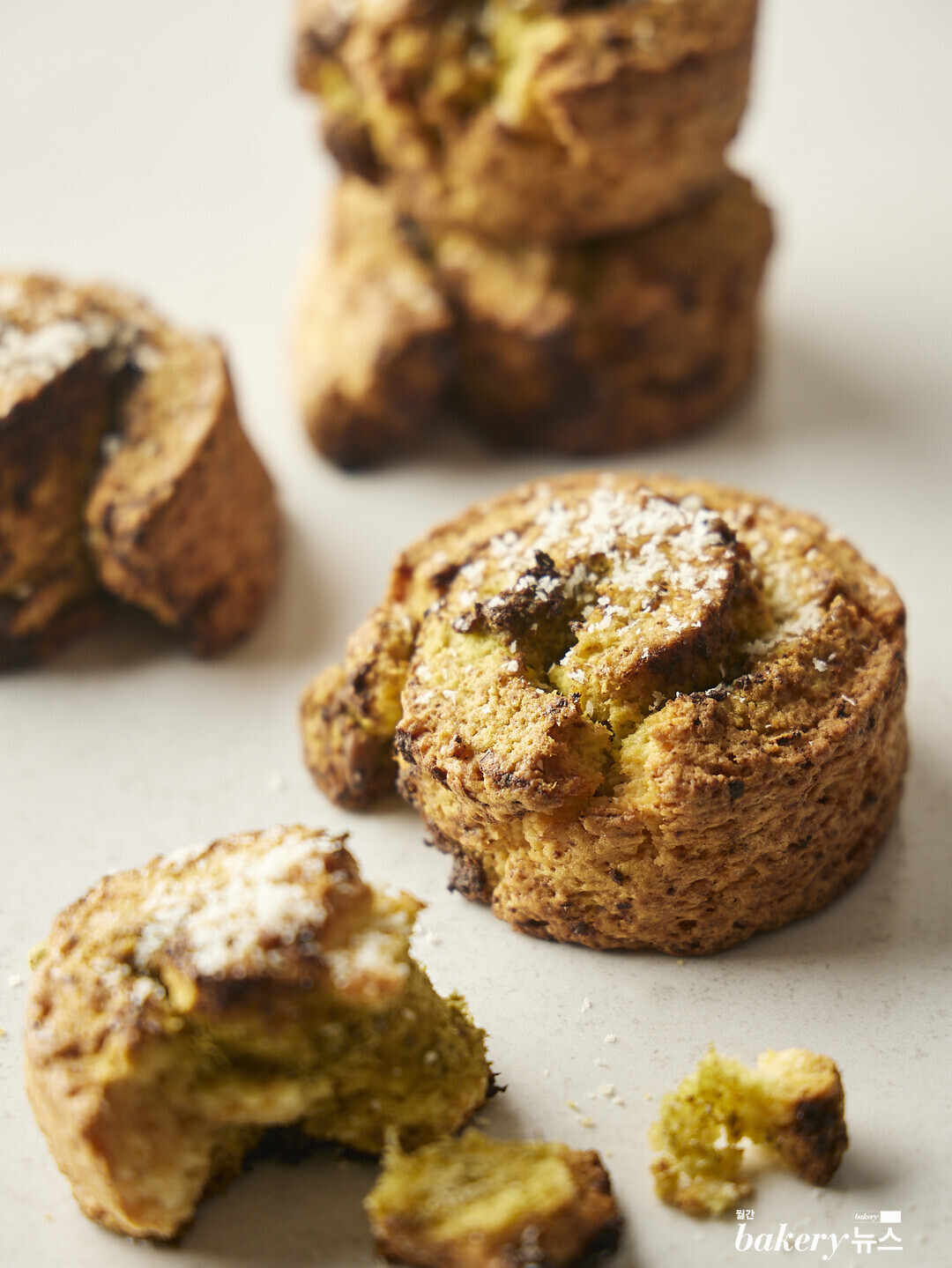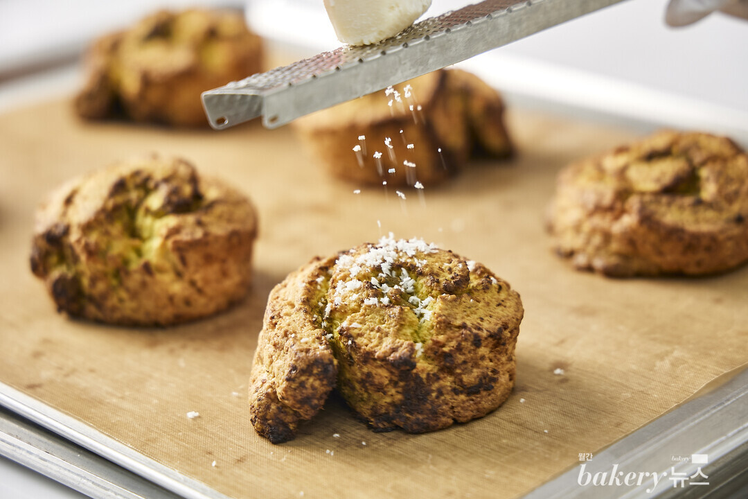 중력분(곰표) 190g치즈 파우더(본이태리) 22g베이킹파우더(선인) 6g설탕(백설) 40g소금(게랑드) 2g버터(브리델) 58g드라이 토마토 20g생크림(엘르앤비르) 63g달걀 42g바질 페스토(데체코)·그라노파다노 치즈 적당량