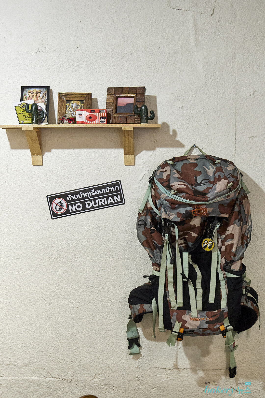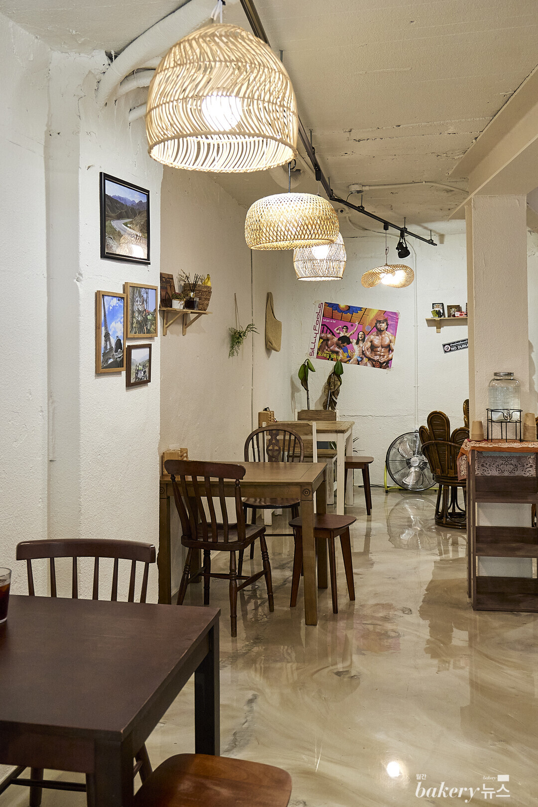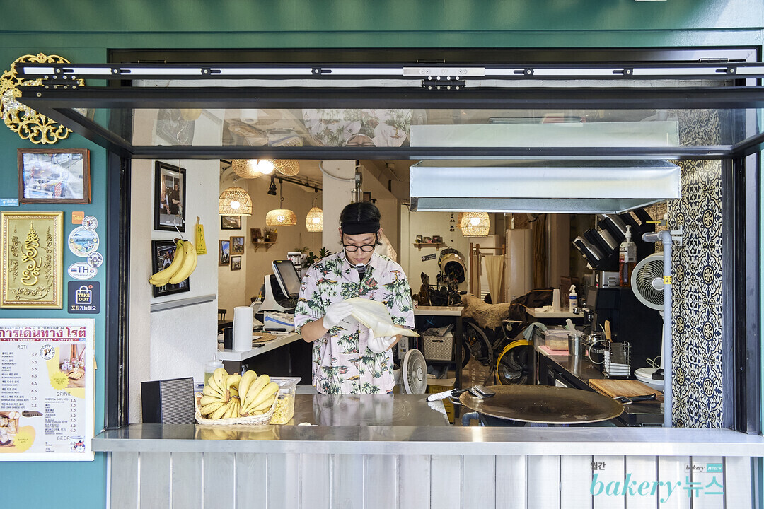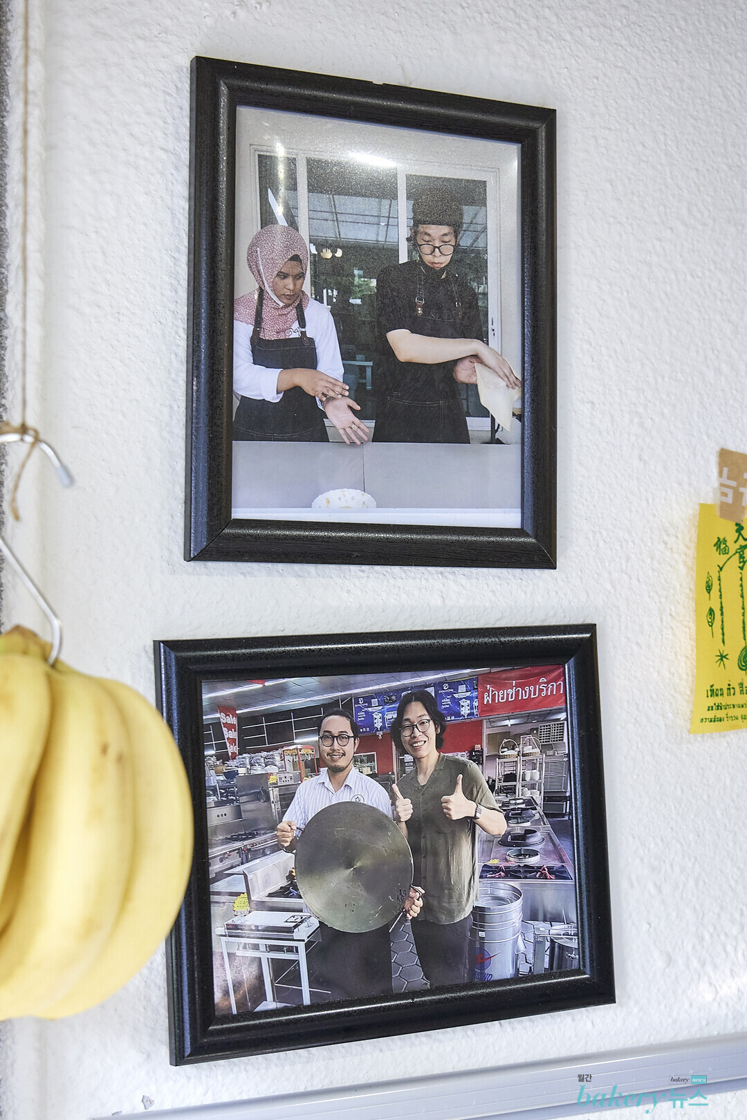 커다란 창문을 통해 길거리를 거닐던 이들까지 모두 로띠 만드는 모습을 볼 수 있도록 꾸려진 져니로띠. 보통 매장이 어떤 나라의 콘셉트라는 것을 보여주기 위해 그 나라의 국기를 인테리어 소품으로 사용하는 것에 반해 져니로띠에서는 태국 국기를 찾아보기 어렵다. “태국 로컬 분위기를 내고 싶어 고민했는데 오히려 국기가 없는 것이 더 현지 분위기를 내는것 같았어요. 김치찌개 가게에 태극기가 없는 것처럼요.” 또 태국 배달 어플인 ‘그랩(Grab)’ 바이크를 매장 앞에 두고, 태국 액자를 걸어 놓는 등 너무 과하지 않게 꾸민 것이 오히려 더 태국에서 볼 법한 매장 같다. 벽 한편에는 강 대표가 직접 여행할 때 메고 다녔던 배낭과 태국에서 먹었던 로띠 사진이 걸려있는데 구경하는 재미까지 쏠쏠하다. 화려하진 않지만, 포인트가 살아 있는 내추럴한 분위기가 공간과 잘 어우러진다.