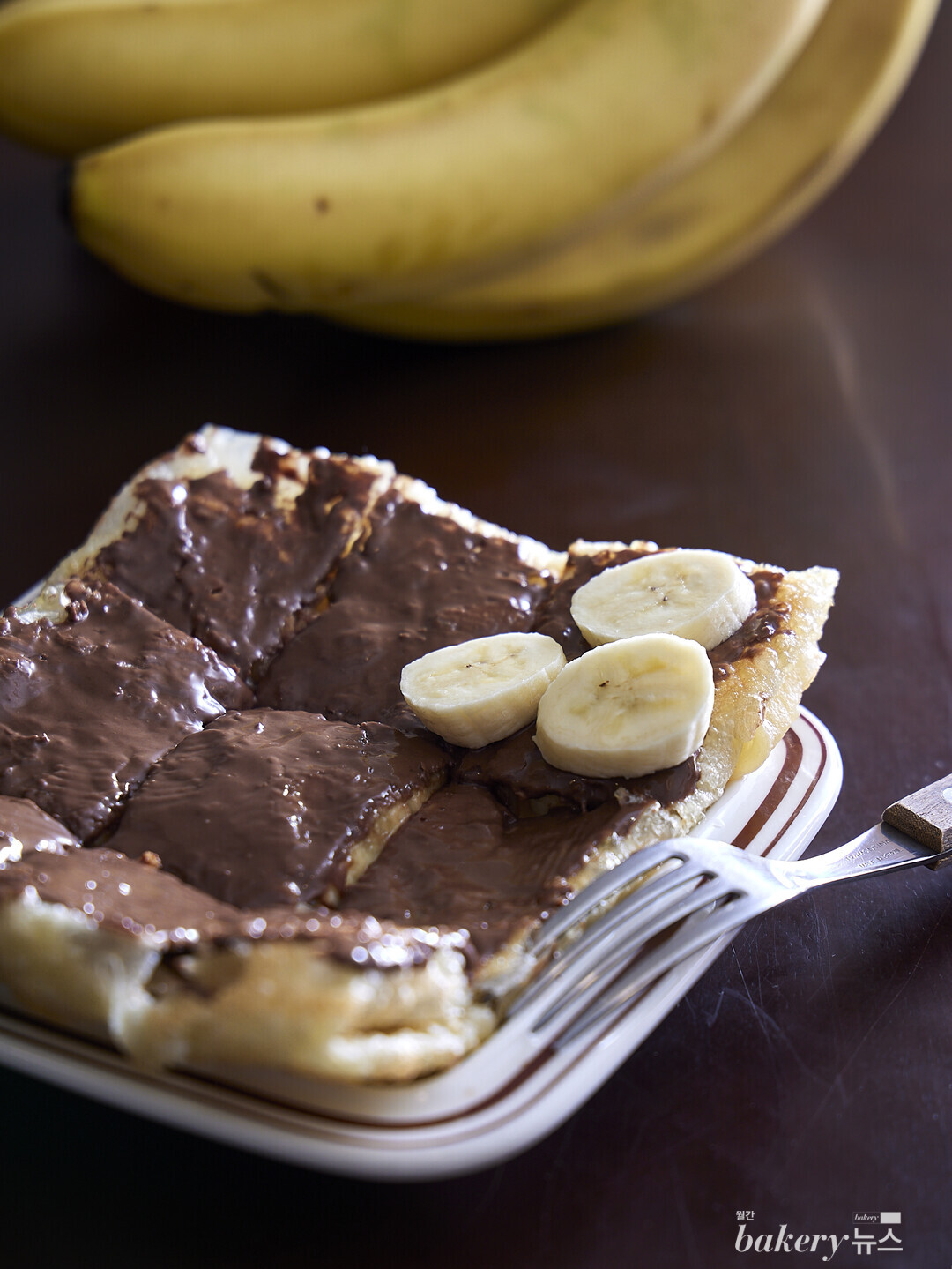 실패 없는 조합, 바나나와 누텔라가 만났다. 바나나에 달콤한 초콜릿 잼인 누텔라가 더해져 어쩌면 모두가 알고 있지만 그래서 더 참을 수 없는 맛이다.