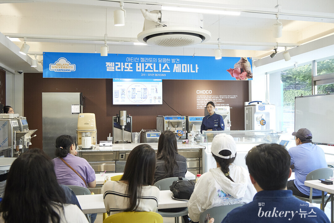 세미나가 본격적으로 시작되자 유시연 셰프는 베이스 재료에 따른 젤라또, 아이스크림, 소르베또 분류법을 통해 콜드 디저트의 개념을 정리한 후 젤라또 제조법에 대해 집중 분석하는 시간을 가졌다. 그는 정석적인 젤라또 제조 공정 단계로 재료 선택부터 보관까지 9가지 스텝을 제시하며, 이중 젤라또 안에 포함된 물과 공기가 날아가는 것을 방지하는 급냉 단계의 중요성을 강조해 눈길을 끌었다. 이후 이 9가지 제조 공정을 3가지 제조 방법 옵션(원재료, 멸균 액상 프리믹스, 프리믹스 분말)에 따라 다르게 설정하는 방법을 상세히 설명했다. 뒤이어 원활한 재고 관리를 위해 냉동고 2개를 설치해야 하는 이유, 매장 규모와 목표 생산량을 고려한 젤라또 머신 선택법, 손익계산서 관리법, 오픈형·밀폐형 쇼케이스 장단점 등 창업 시 알아야 할 실질적인 정보에 대해 알아보았다. 유시연 셰프는 이론 설명 중간중간 칼피지아니의 ‘레디 셰프’를 이용해 ‘수박 소르베또’와 밀크팜 베이스를 활용한 ‘레몬 젤라또’를 시연했다. 참가자들은 “앞서 익힌 이론 내용을 시연을 통해 실전에 바로 적용할 수 있어, 생생한 가르침이 됐다”며 유익한 시간이었다는 소감을 전했다.