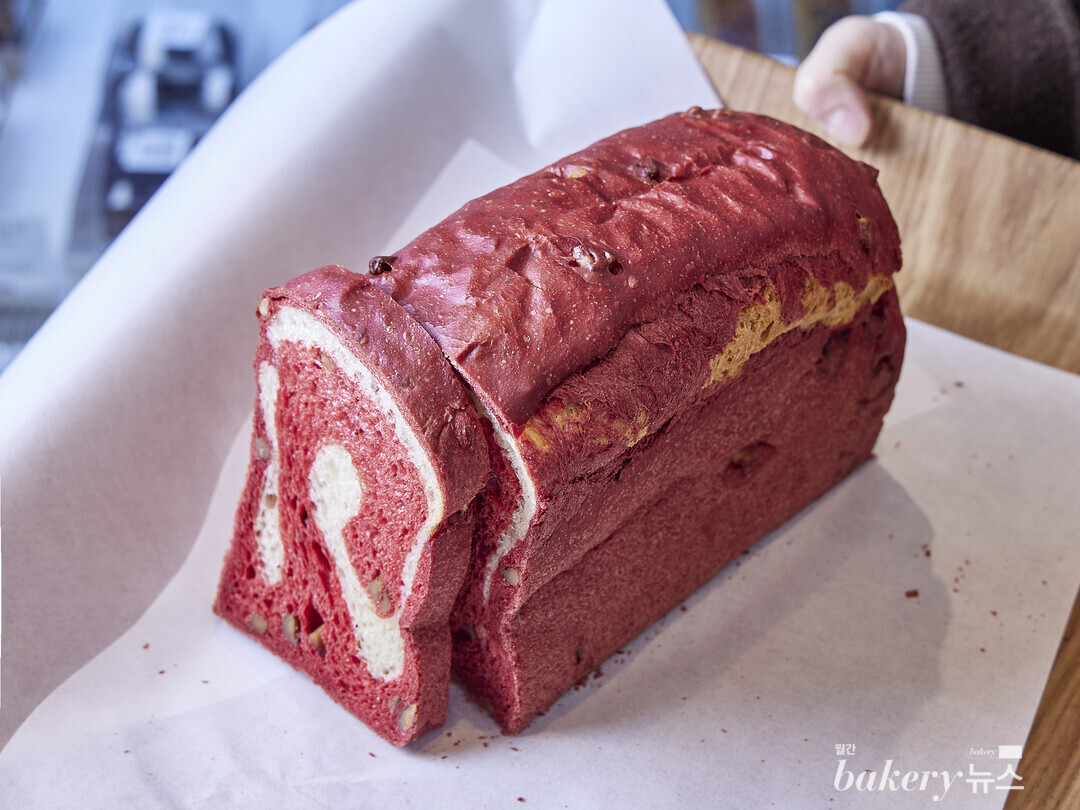 홍국 쌀가루로 건강과 시각적 재미를 모두 챙긴 식빵이다. 반죽에 타피오카 전분을 넣어 쫄깃한 식감을 구현했다. 식빵을 잘랐을 때 단면에 하얀 마블 무늬와 푸짐하게 박혀 있는 호두를 발견할 수 있다.