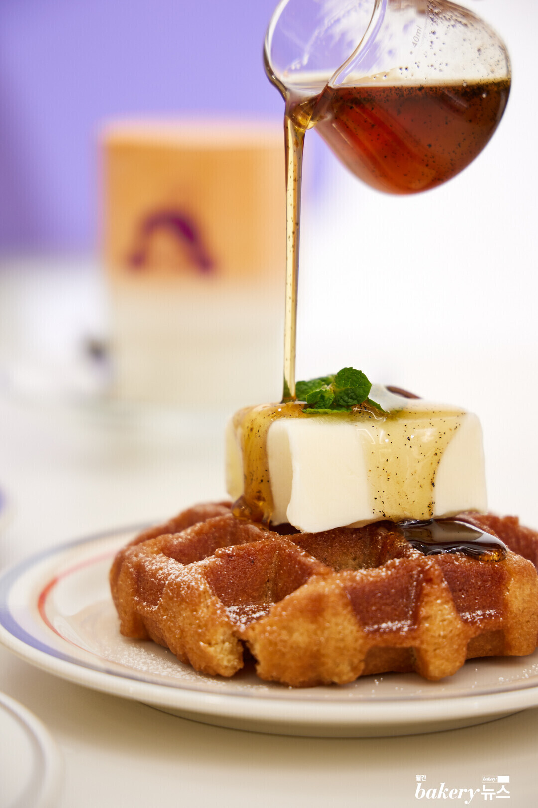 피낭시에 반죽을 와플팬으로 구웠다. 쫀득한 버터플에 아이스크림과 수제 바닐라빈 시럽을 추가해서 먹으면 금상첨화다.