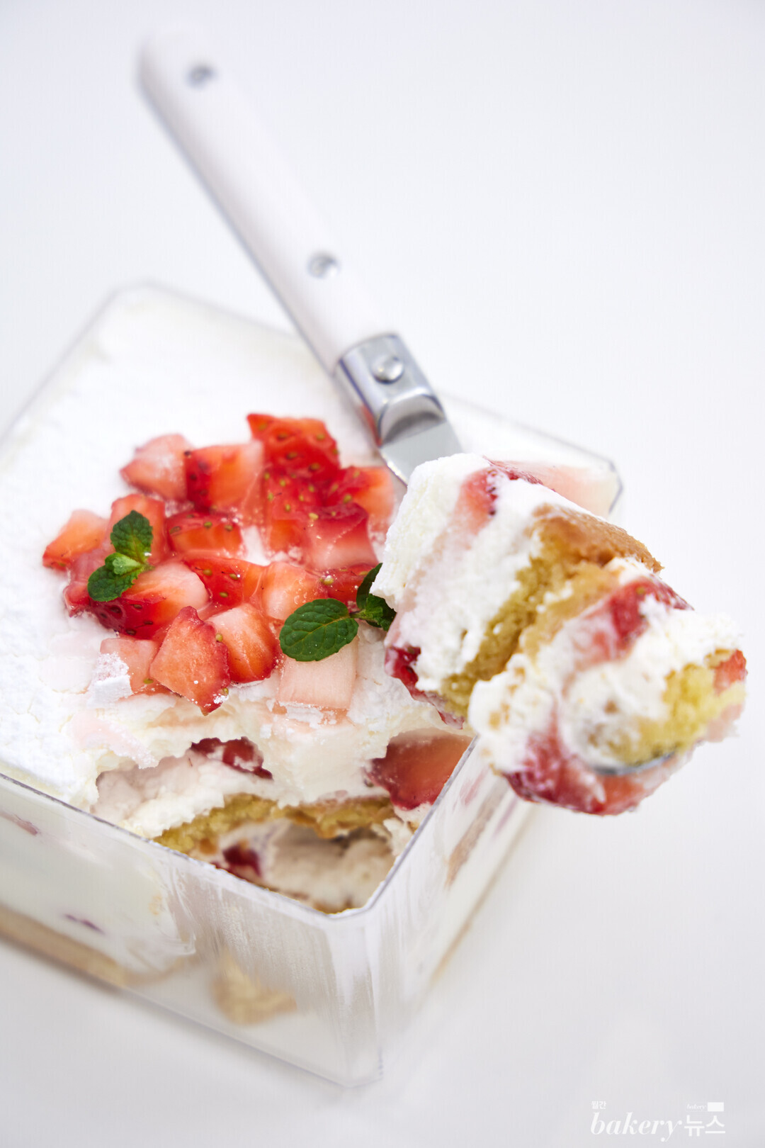 생크림과 딸기, 솔트 바닐라 피낭시에로 구성된 떠먹는 케이크. 상큼한 딸기, 담백한 생크림, 달달한 피낭시에가 조화를 이룬다.