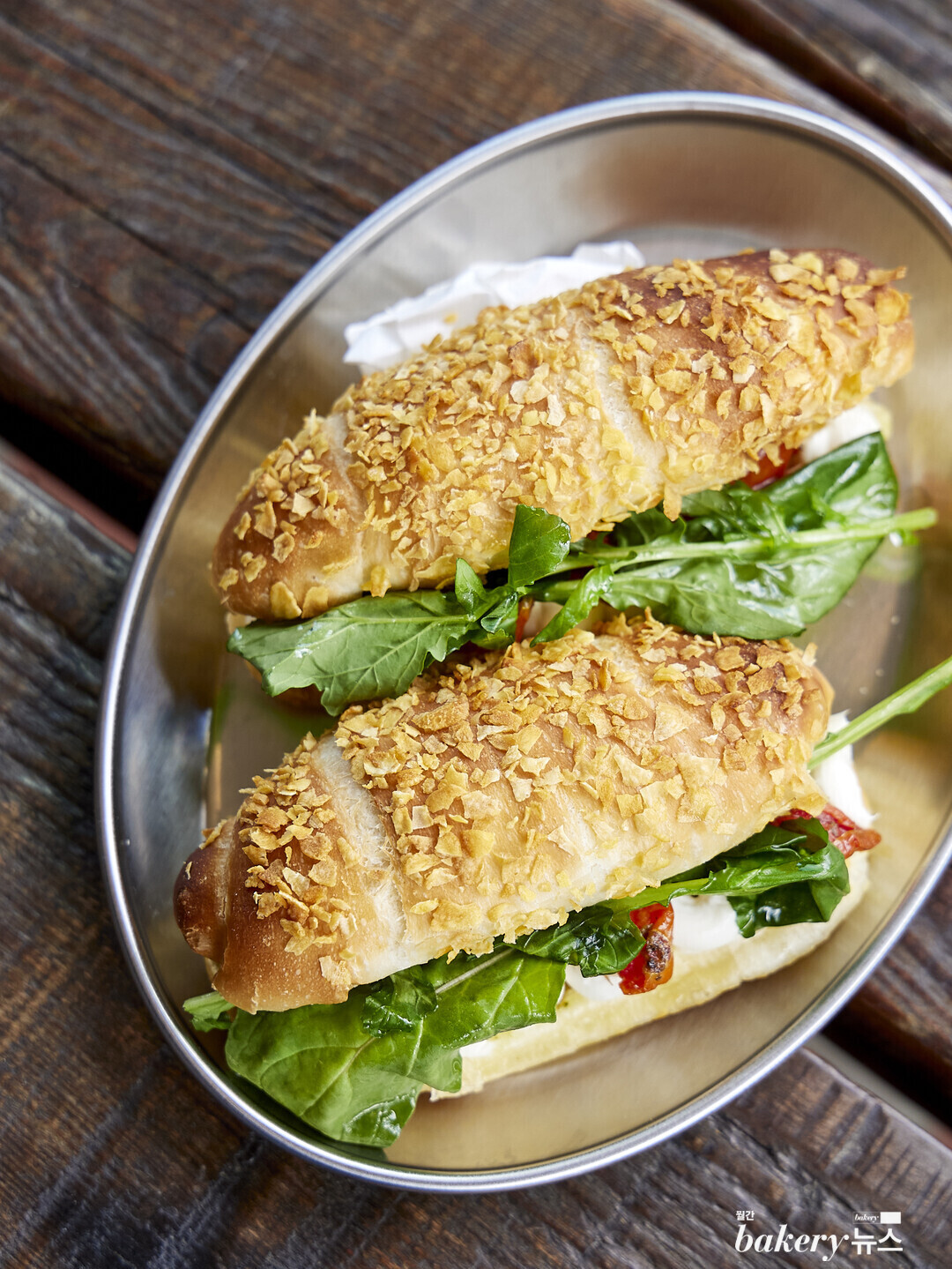 소금빵에 바질 페스토와 루콜라, 선드라이드 토마토, 치즈 등을 샌드했다. 작은 사이즈라 부담없으며 크런치를 토핑해 씹는 식감을 더했다.