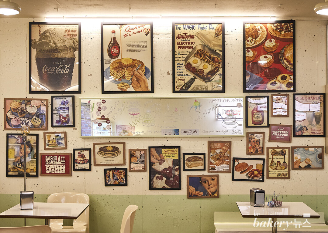 웨스턴챕터는 인테리어 또한 남다르다. 벽돌 건물 1층으로 나 있는 비밀 통로 같은 계단을 따라 올라가면 미국 특유의 빈티지한 분위기가 물씬 풍기는 내부를 만나게 된다. 구석구석 실제 미국을 연상케 하는 인테리어는 김효철 대표의 손길이 더해져 완성됐다. 코카콜라 로고가 새겨진 체스판, 미국 원서, 선반에 가득 채워진 갖가지 미국 식재료들까지 미국 어딘 가에서 실제 운영하는 식료품점 같다. 김 대표가 미국에 있을 당시 방문했던 팬케이크 전문점이나 데일리 레스토랑 같은 분위기를 구현하기 위해 벽의 포인트 컬러나 바닥 시트지까지 하나하나 선별했기에, 이 같은 분위기가 완성됐다. 또 일러스트까지 배워 매장 로고, 패키지 박스까지 직접 제작하며 웨스턴챕터만의 개성을 살렸다. 너무 과하지 않은, 실제 미국에 와있는 듯한 분위기를 연출한 덕에 이곳에서 맛보는 치즈케이크 한 입은 더욱 매력적이다.