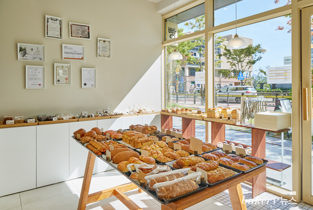 고요하고 평화로운 분위기의 경기 광주시에 어느 한 동네. 찬란하게 비추는 햇살을 따라 길을 걷다 보면 새하얀 색감의 아기자기한 빵집이 나타난다. 문 너머로 새어 나오는 갓 구운 빵 냄새에 이끌려 매장 안으로 들어가면 빵으로 가득한 풍경이 눈 앞에 펼쳐진다. 겹겹이 바삭거리는 식감이 매력적인 크루아상, 뺑 오 쇼콜라 같은 페이스트리와 알록달록한 머랭쿠키, 보기만해도 든든한 식빵과 소시지빵 등 진열대에 올라간 빵의 종류는 무수히 많았다. 다양한 빵들에 스포트라이트를 켠 듯 햇살이 드리우는 장면은 마치 한 폭의 명화 같다.